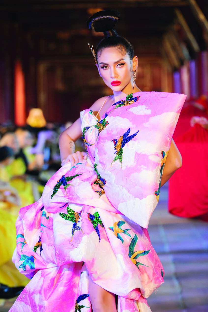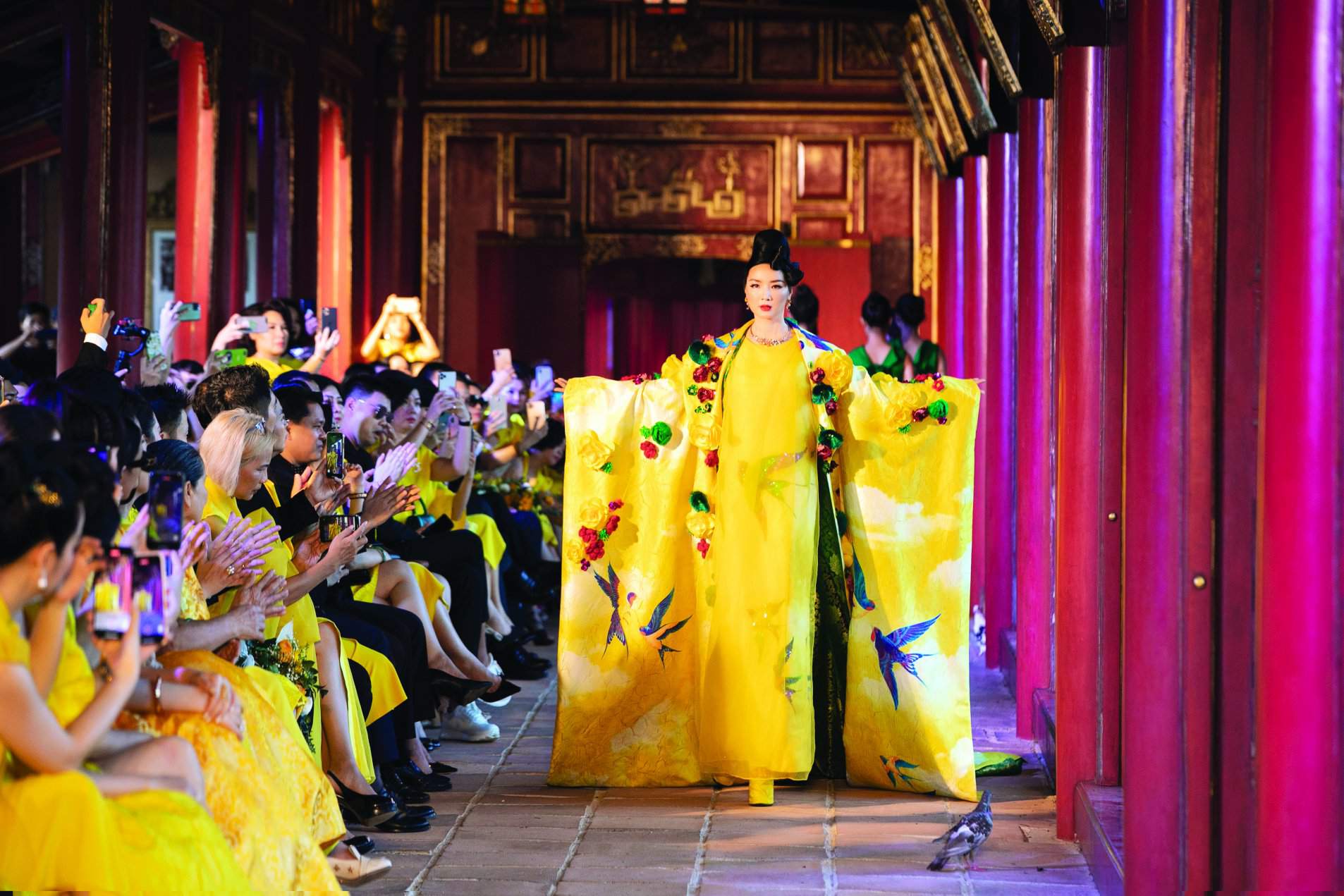 Against an ancient setting and the melodies of Vietnam Royal Court Music, supermodel Vo Hoang Yen, Miss Tieu Vy, strode confidently in grand outfits. A total of 140 designs were embellished with Eastern details, such as the swallow, which represents good omens, and five-colored clouds, which symbolize luck. The beauty of these details lies not only in their aesthetic sense but also in the messages of hope during the grim days of the pandemic that VUNGOC&SON have conveyed. Through modern designs such as bodycon dresses, pencil skirts, modernized áo dài and large bow dresses, the show brought a nostalgic vibe yet these designs remained à la mode and highly wearable.