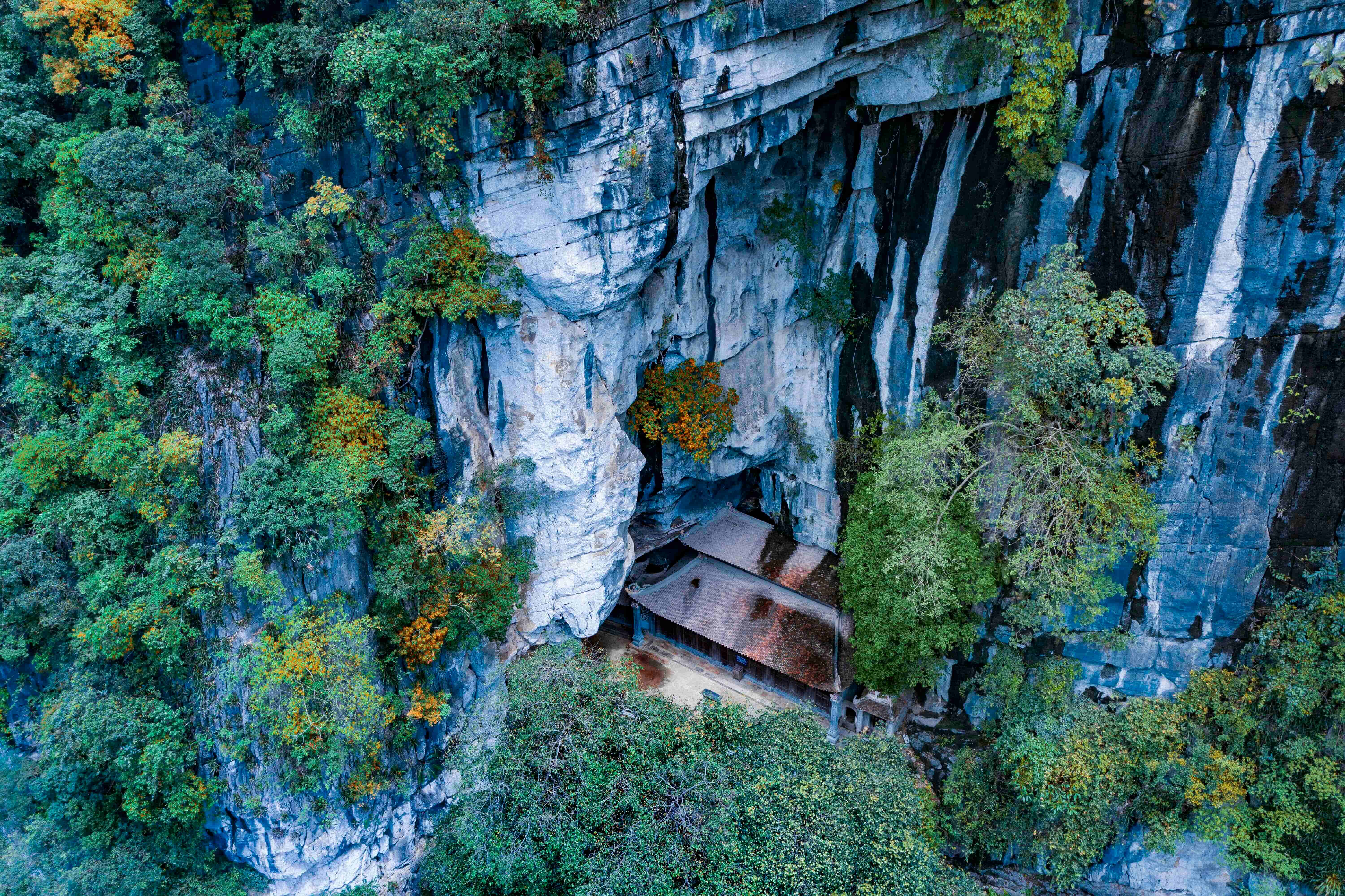 Serving as an outer bulwark and forward outpost of the Hoa Lu capital, Thien Ton Grotto is located at the foot of Dung Duong Mountain in Da Gia Hamlet. According to legend, King Dinh Tien Hoang once received foreign envoys here. Stalactites hang abundantly from the cave ceiling, their shapes fantastical and varied. Thien Ton honors not only the Buddha but also Tran Vu (Zhenwu), the Taoist northern guardian deity, who in Vietnam is believed to exorcise malevolent forces, tame the waters, and protect agrarian communities.