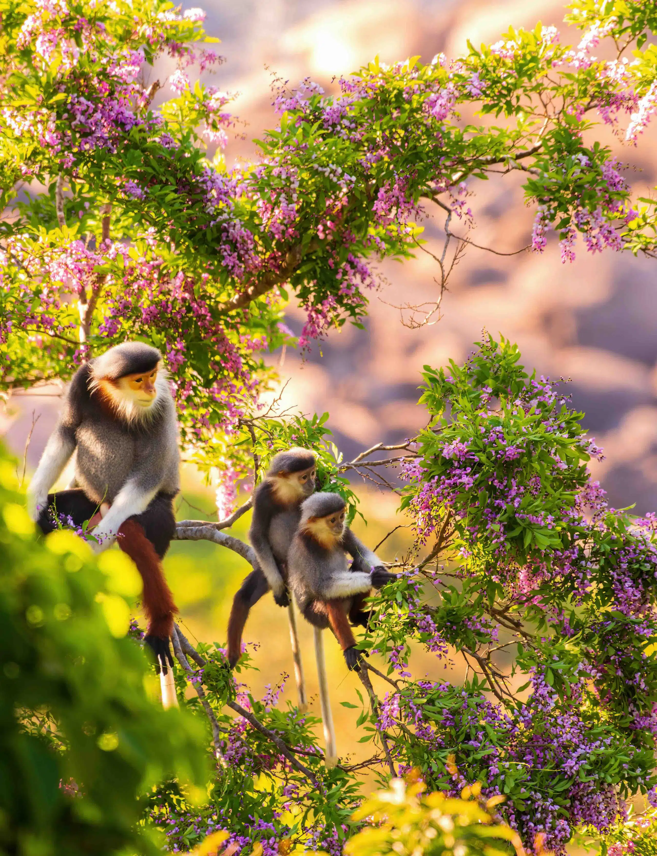 Amid a sea of violet blossoms, red-shanked douc langurs grace the forests of the Son Tra Nature Reserve with their presence.