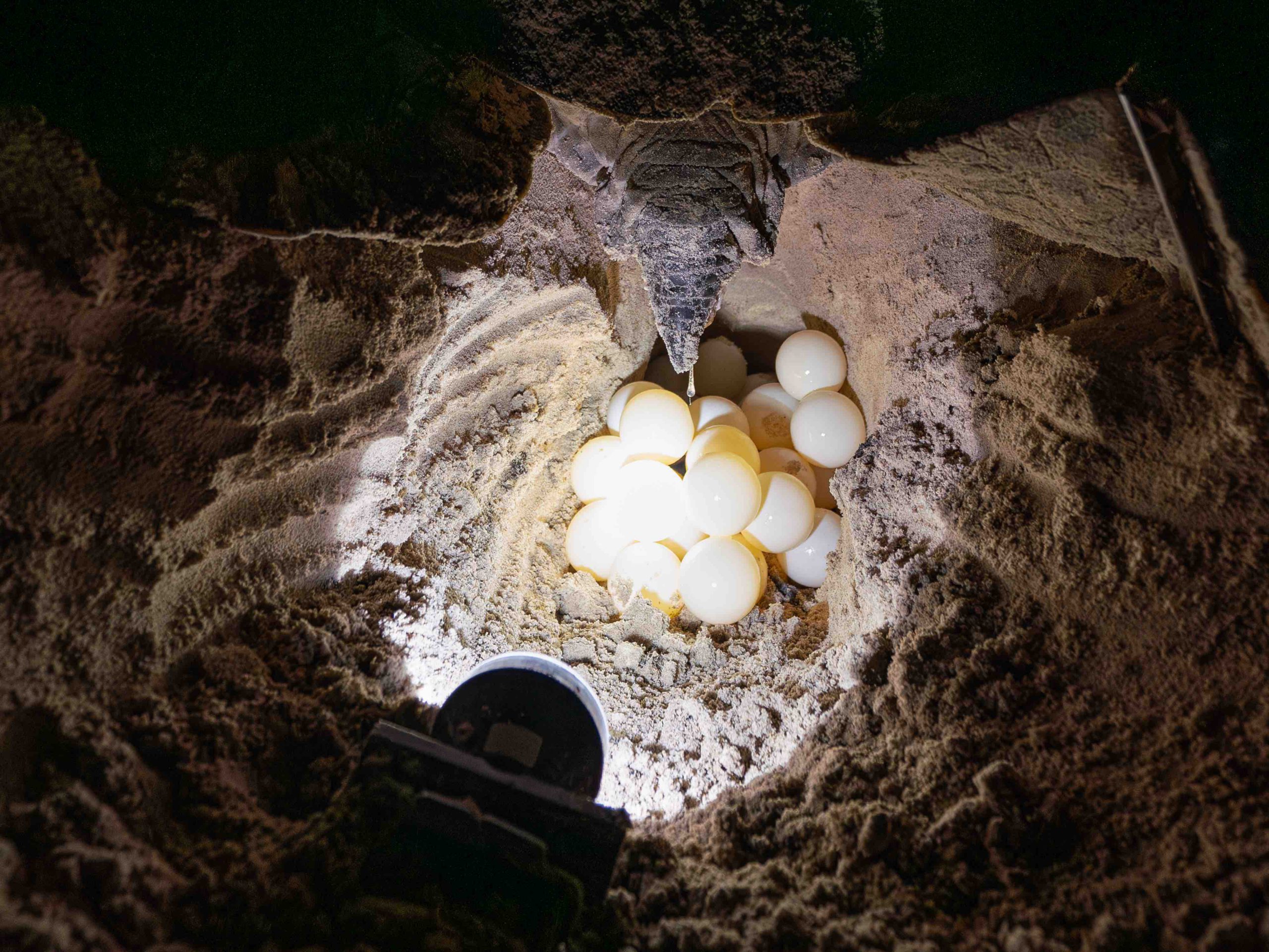 After digging the hole, the mother turtle starts laying eggs. Each clutch can contain between 80 to 150 eggs. The eggs are small and round, about the size of a ping-pong ball. The entire process can last from one to two hours. The rangers ensure that visitors maintain a safe distance to avoid frightening the mother turtle, which could affect the nesting process.