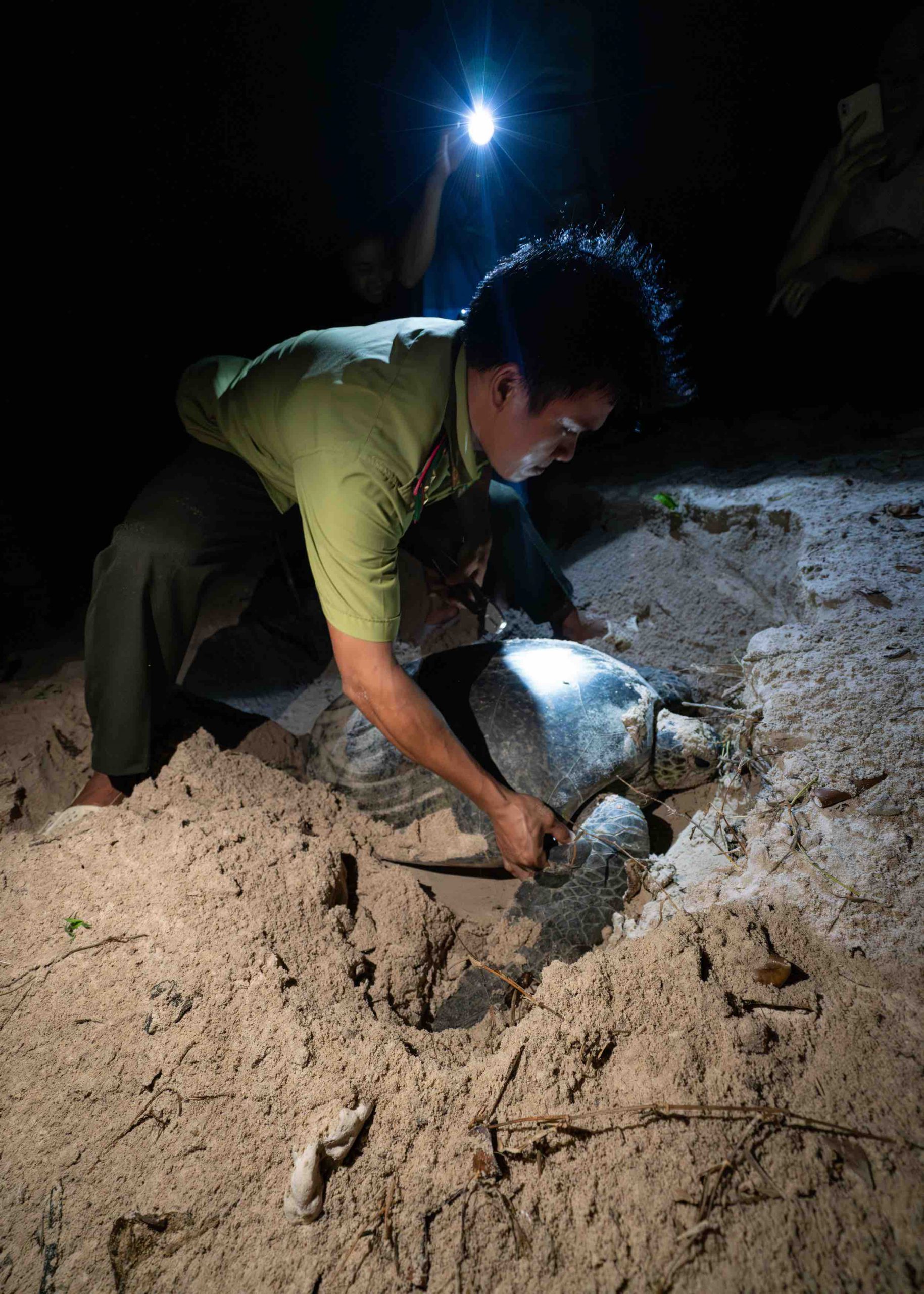 As night falls, rangers patrol Bai Cat Lon Beach. If they spot a sea turtle coming ashore to lay eggs, they notify the guides to bring visitors over.