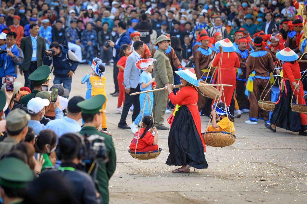 The night of the 9th features a preliminary ceremony to inform the spirits. At around 2 AM on the 10th, the main ceremony takes place with full offerings and solemn rites performed by the main priest and his assistants. Following this, a reenactment of the fishing trade is performed to honor the patron saint, the founder of the village’s livelihood. After the master of ceremony beats the drum three times, the village head throws money and offerings into the courtyard, where local children – who have been dressed as sea creatures – scramble to collect the bounty. Meanwhile, young men, playing fishermen, cast their lines to “catch” these sea creatures. A group carries a red-painted boat with a fisherman on board around the courtyard, circling the children, and the fisherman casts a net to “catch” the “fish” below. Although trying to break free, these “sea creatures” are rounded up in the middle of the yard while the fisherman reenacts the traditional yo-heave-ho and net pulling activities. As the net closes, the fisherman jumps down to catch the largest “fish” and brings it into the hall as an offering. The “caught” sea creatures are placed in baskets and carried by women to the beach for symbolic cleaning, or taken to the market for sale, where mock negotiations take place as if they were real seafood.