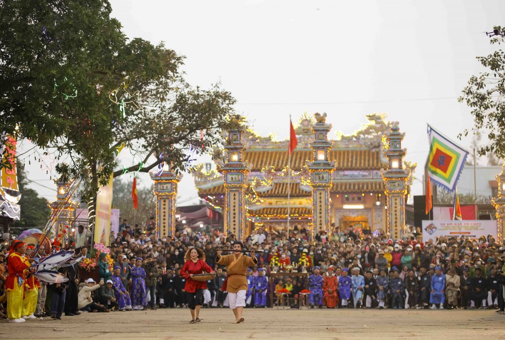 On the evening of the 9th of the first lunar month, the elders and villagers of Thai Duong Ha stage a procession to bring the patron saint from his temple to the village hall. The procession includes gongs, drums, flags, and a traditional music ensemble, with a symbolic boat carried by young men, parading from one end of the village to the other before entering the village hall.