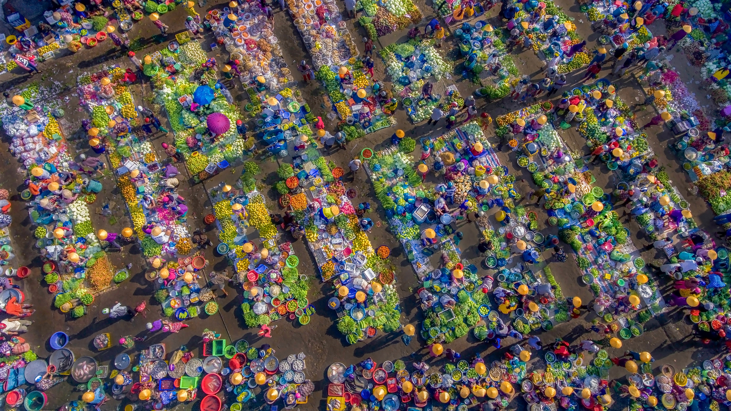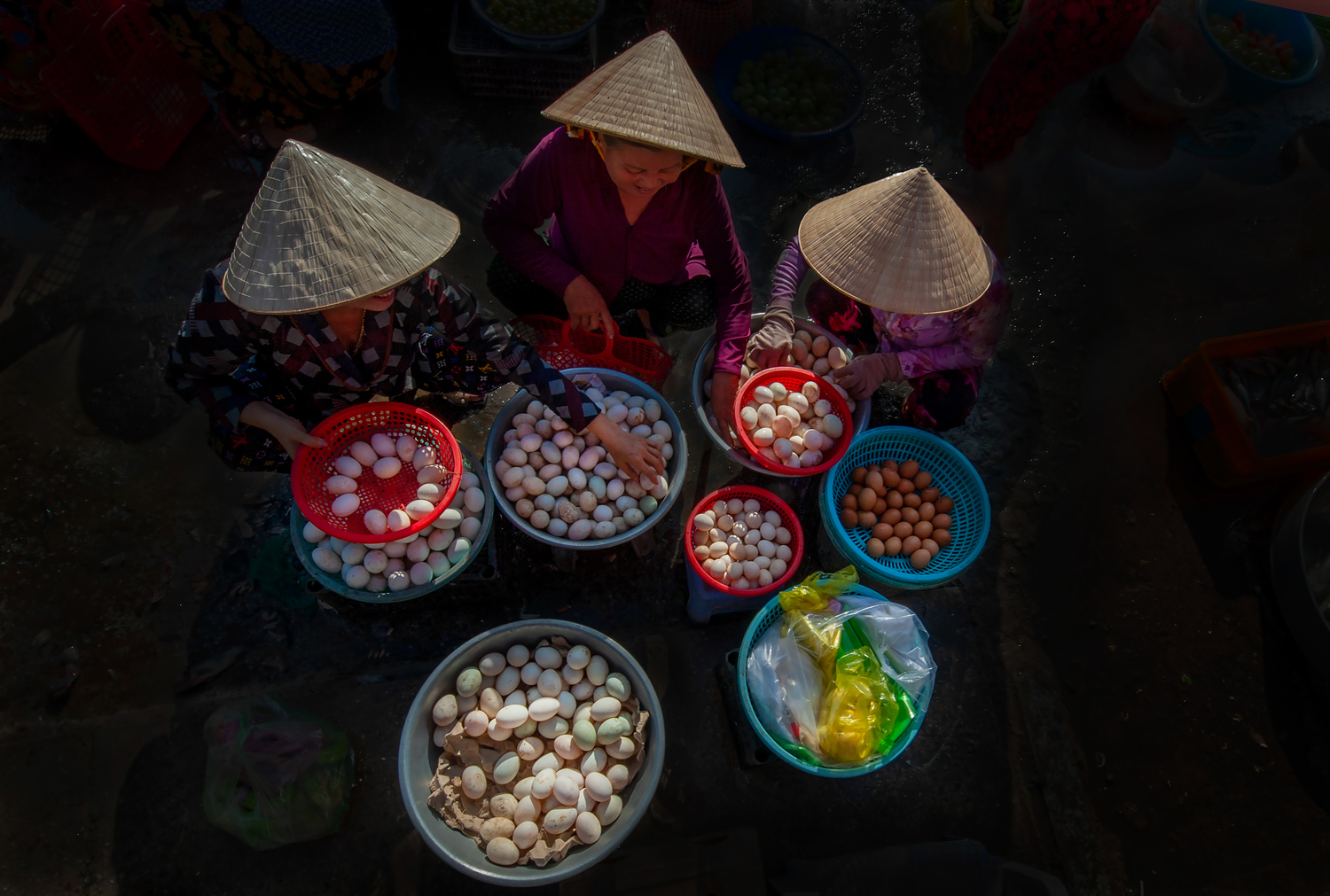 Mr. An Tran, a local resident, explained that the market earned its colloquial and rustic name because traders often squat or sit on small chairs, arranging their goods within an area of about 2 to 4 square meters. From a bird’s-eye view, you can see the traders sitting next to each other in rows, with pathways weaving between them for customers, all within a total area of about 700 square meters. The atmosphere is bustling. Despite its name, the “Squatting Market” operates in a very orderly manner, with neatly organized spaces and goods arranged by category, contributing to a relaxed atmosphere for both buyers and sellers.