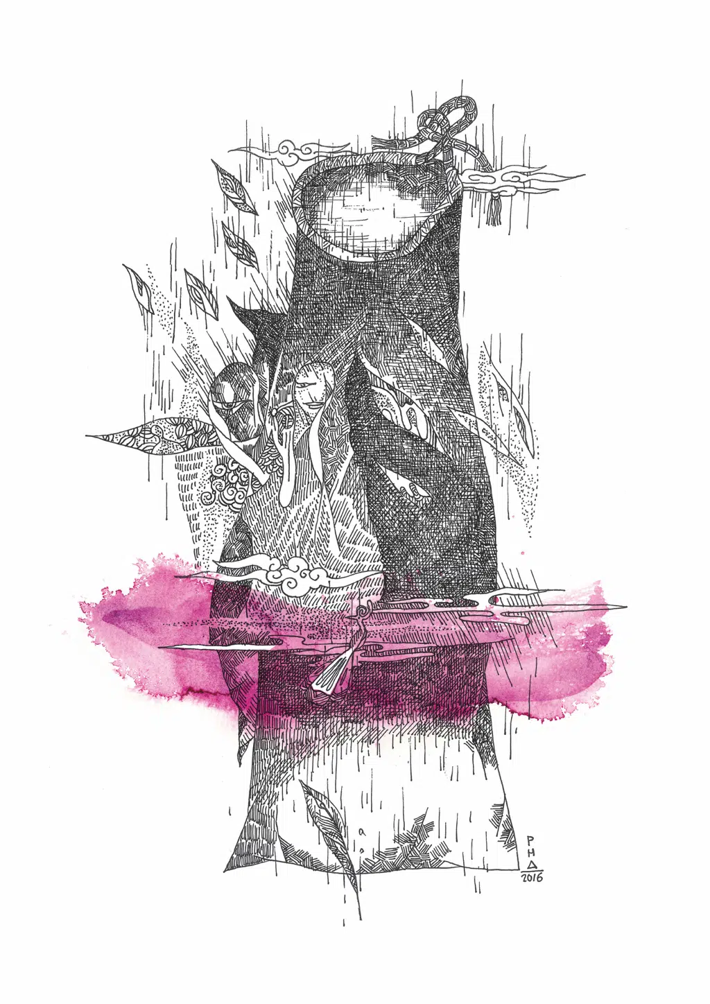 One day a strong wind arose. The couple looked outdoors and saw the huge bird eating the star fruit. Although it had only taken a few bites, the couple howled: “Our entire family survives from this fruit! How will we live if you eat them all?”