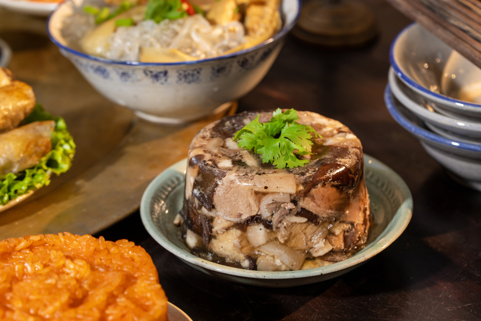 Traditional aspic is made from pork hock, pig’s ears, shiitake mushrooms, and wood ear mushrooms. In the cold weather of early spring, there’s nothing more delightful than enjoying aspic with pickled onions, a true Northern Tet delicacy.