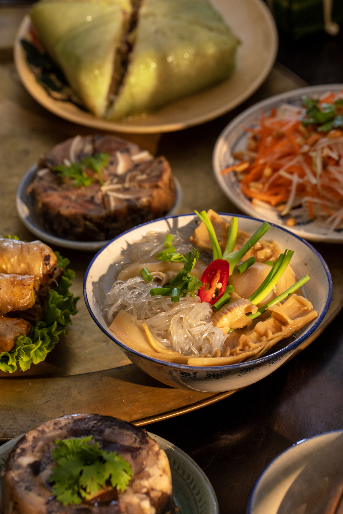 Among traditional soups, a bowl of glass noodle soup with dried bamboo shoots and either pork trotters or ribs is essential. The pork trotters or ribs are cut into bite-sized pieces and sautéed until fragrant, then simmered on low heat. The bamboo shoots are soaked and boiled several times, then stir-fried with dried onions and spices. When arranging the feast, glass noodles are blanched and added to a bowl, then topped with pork trotters, bamboo shoots, and green onions. A sprinkle of fresh coriander adds to the dish’s appeal.