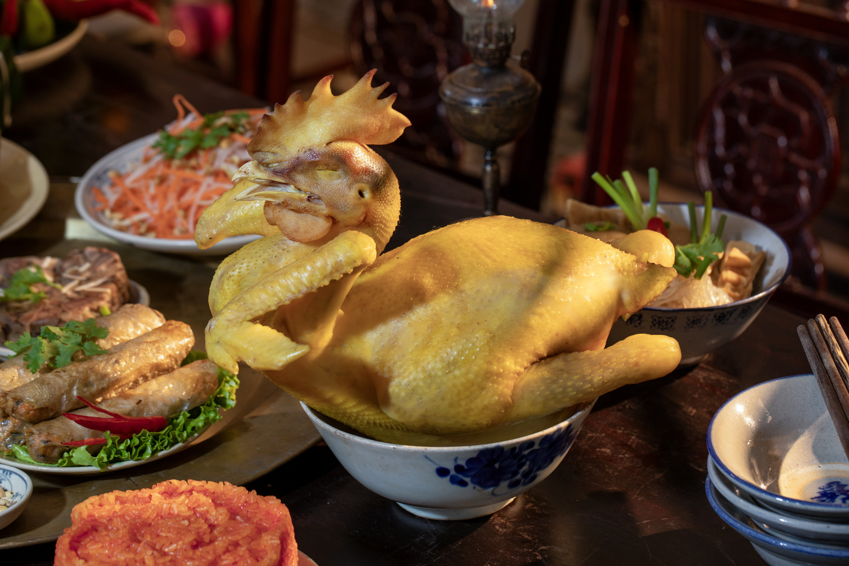 Boiled chicken is a simple yet indispensable dish for Tet. Chunks of golden-yellow chicken sprinkled with finely chopped lime leaves and dipped in a mixture of salt, pepper, lemon, and chili create an unforgettable flavor.