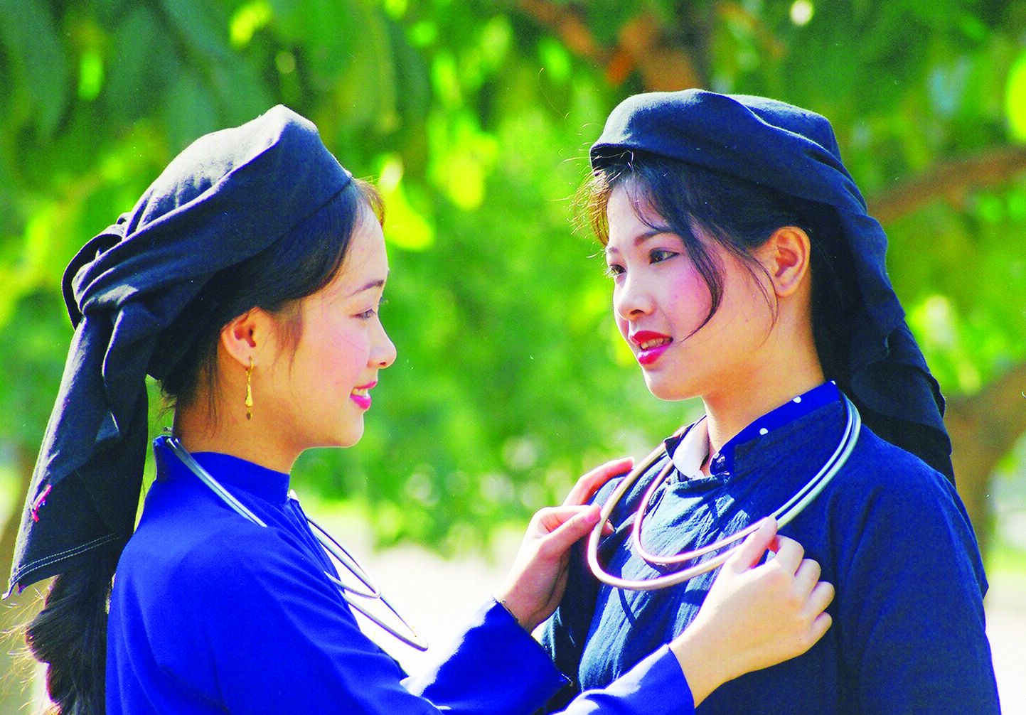 Another unique element of the Then ceremony is the colorful clothing worn by Then masters and others that participate in the rituals and singing and dancing performances. During Then singing, people will wear traditional costumes representing their ethnicity while Then masters will wear hats with tassels of various colors, creating a formal and mystical air. Women dress in long shirts, dresses, scarves and belts, all in indigo blue or purple without much decoration or embroidery, in order to highlight their necklaces, bracelets and xa tich (silverchains worn around the waist as an accessory). Women also hold a pair of rose-colored paperfans, while men remain modest in long pants and short indigo-dyed cotton blouses.