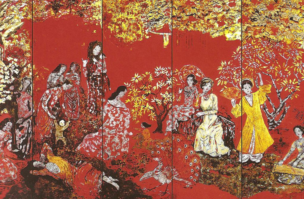 My first encounter with an Indochinese lacquer painting, depicting a young woman, was in Paris. The artwork and I were alone in a still space, as the gilding on its scarlet and ebony layers stirred powerful emotions of longing within me.