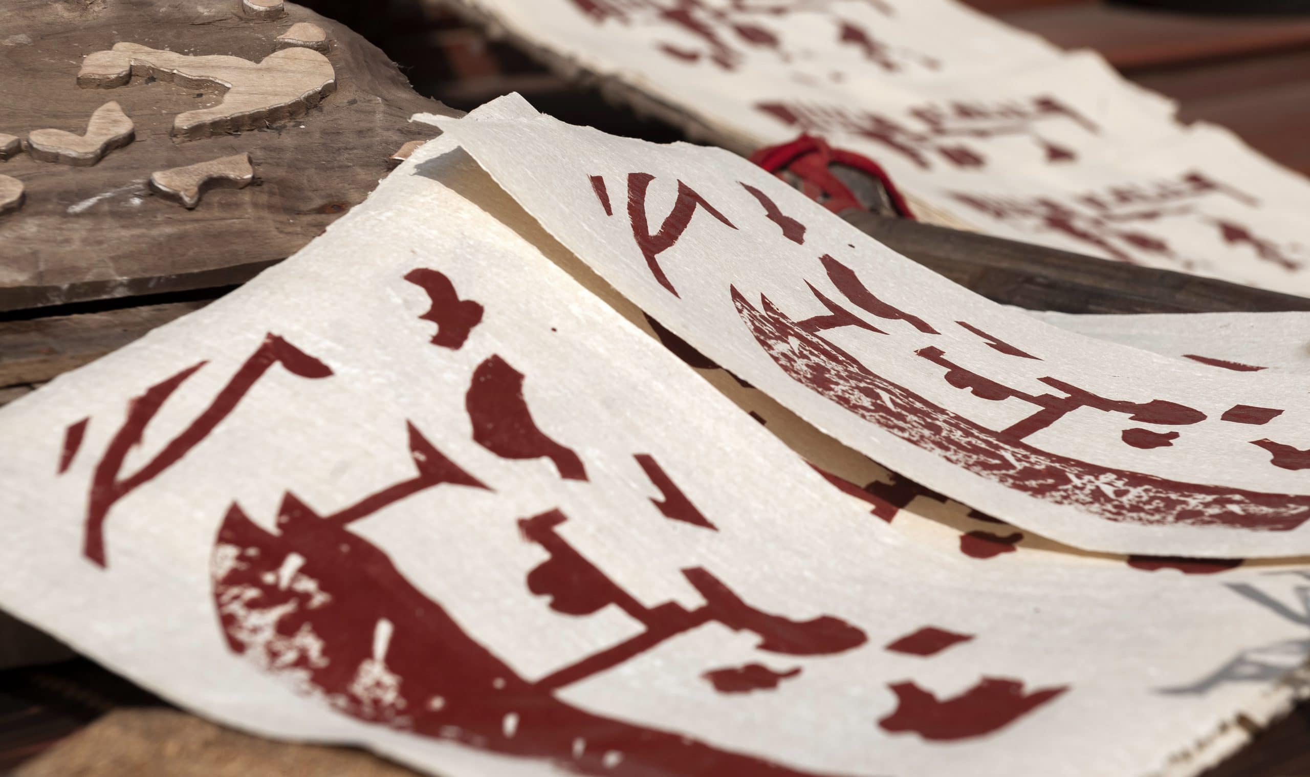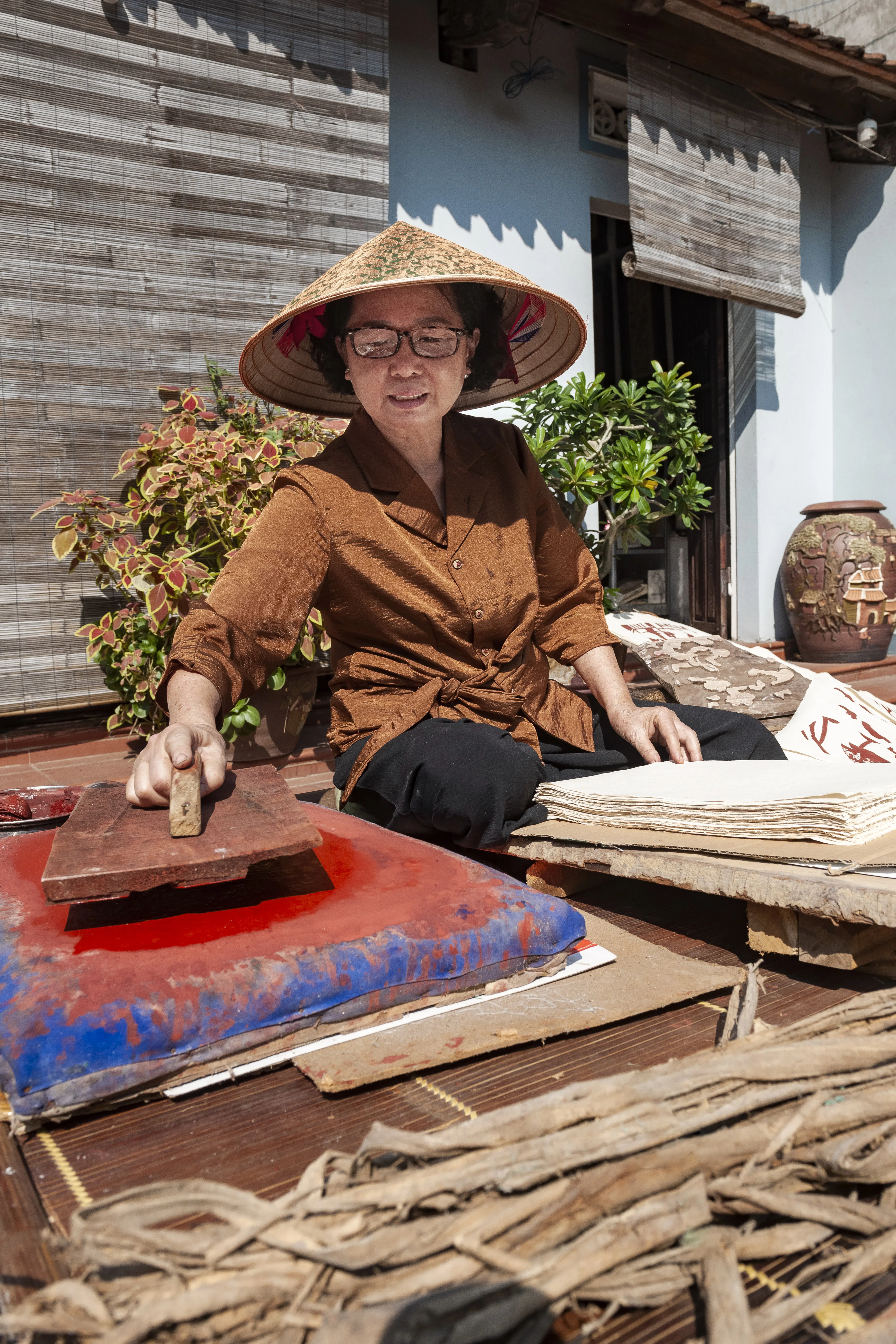 After the paper and paint are prepared, the next step requires the woodcuts. Sheets of newly-made dó paper measure 30x70cm. They are cut into halves (30x35cm), thirds (30x23cm), and “jackfruit leaf” sizes (30x17cm). The woodcuts must fit these sizes.