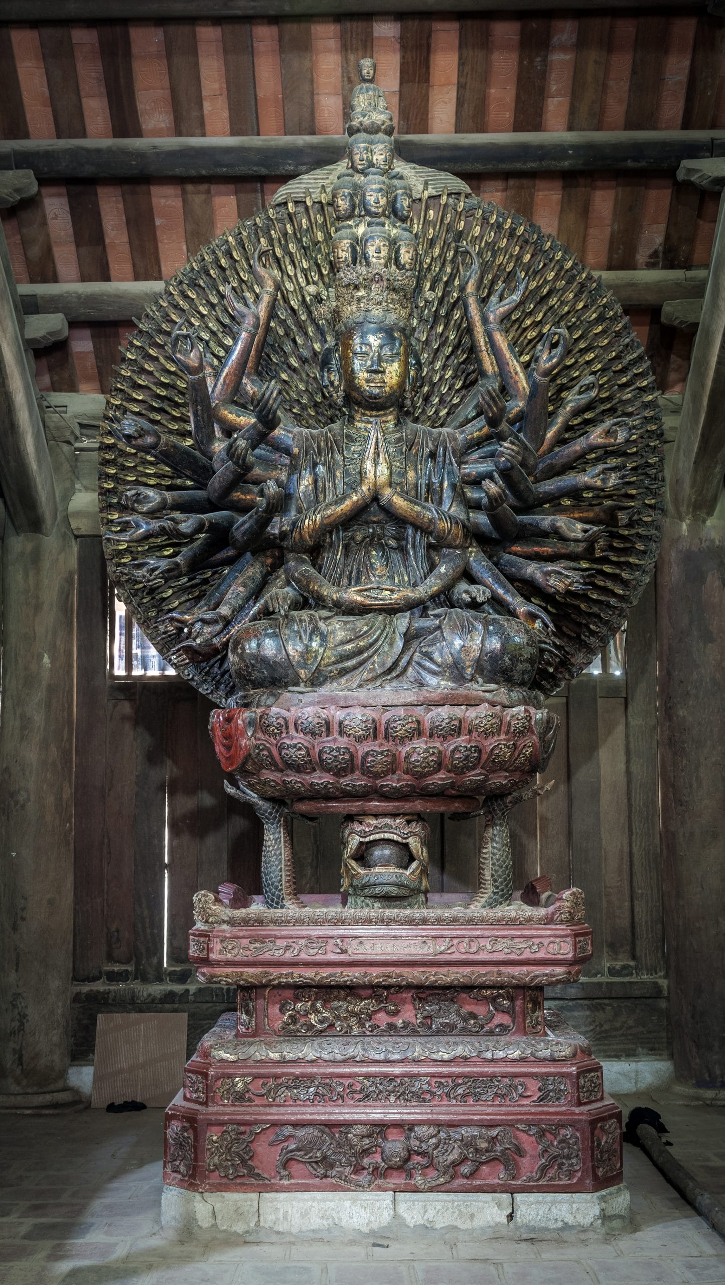 But Thap Pagoda houses a special treasure, the Avalokiteśvara statue. With a thousand eyes and a thousand arms, this is a masterpiece of Vietnamese sculpture art. The statue is 3.7 meters tall, 2.1 meters wide, and has 11 heads, 46 big arms and 954 small arms. There is an eye on the palm of each hand. The image depicts the boundless power of the Avalokiteśvara Bodhisattva who can control everything in the universe and help mortals to attain enlightenment. It took a sculptor with the surname of Truong ten years to create this masterpiece, which was completed in 1656. The pagoda’s main sanctuary holds a complete set of statues, including a Tam The statue, Bodhisattvas like Thich Ca Tuyet Son, Van Thu and Pho Hien, and two rows of 18 Arhats. All of the statues, altars, and wooden reliefs carved with images of dragons and phoenixes on the beams of the central house are outstanding examples of Vietnamese Buddhist sculptures. The stone railing that surrounds the main sanctuary is decorated with 26 reliefs of masterful sophistication, depicting sacred animals and beautiful scenes of nature.
