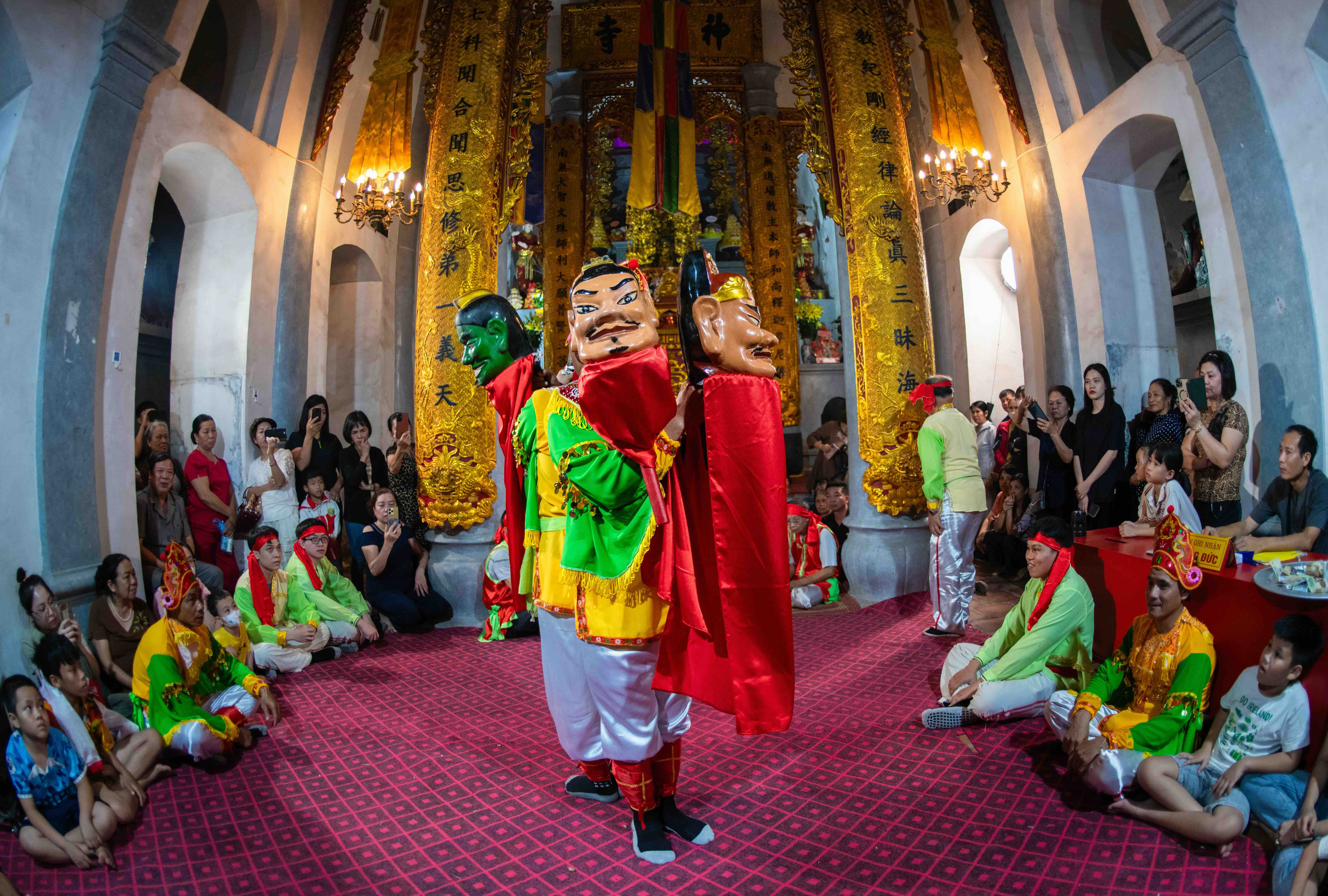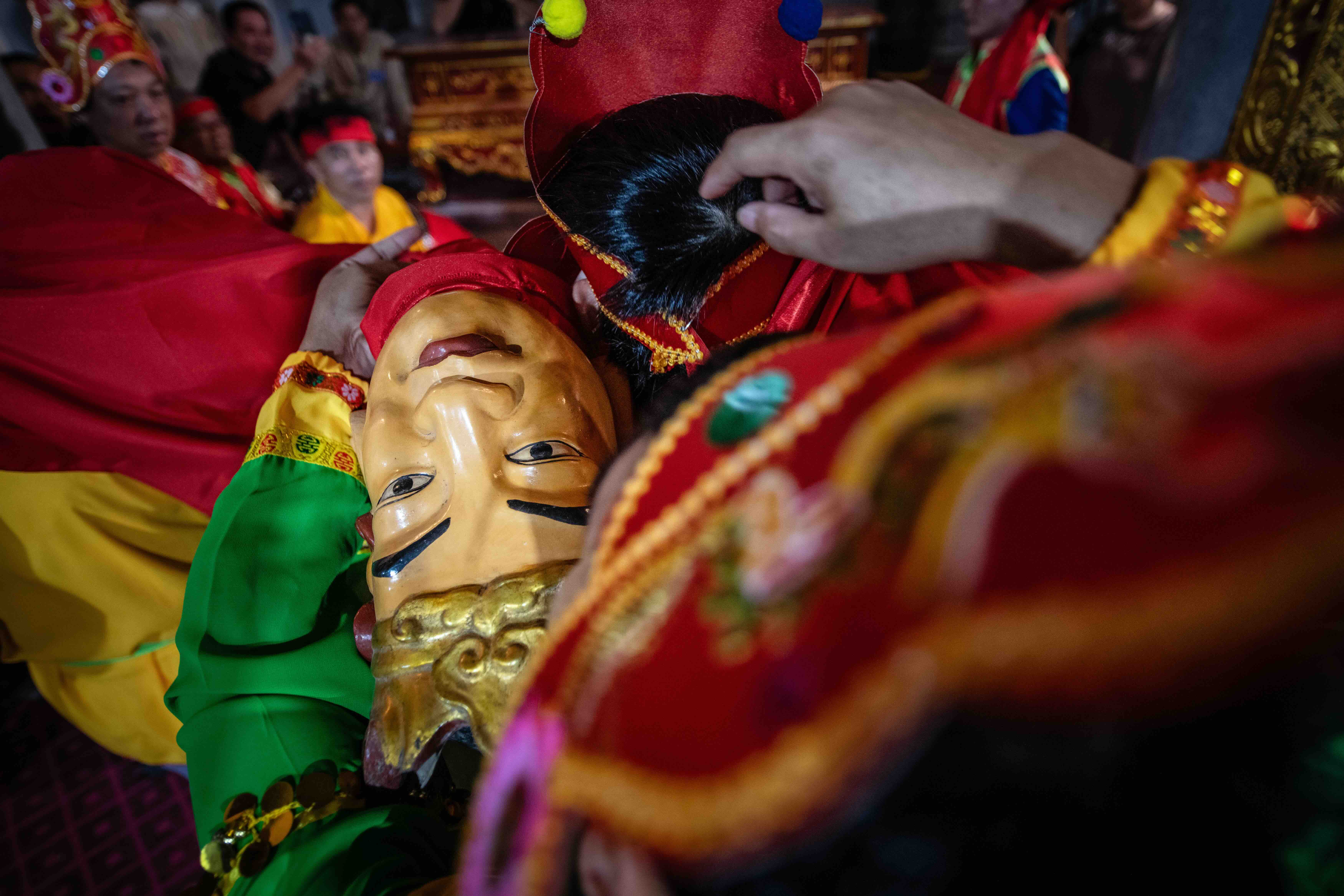 The puppets’ heads are carved from jackfruit wood to a uniform size, coated with natural lacquer, and vividly painted. Each head has a handgrip at the nape about 40 cm long (approx. 15.7 in), with an interior cavity about 30 cm across (approx. 11.8 in), and weighs around 3 kg (approx. 6.6 lb). Paired heads differ in facial color and contours. Kept behind the Buddha’s main altar, they are regarded as sacred effigies. After being honored with incense, the puppet heads are carefully stored and only brought out on traditional festival days.