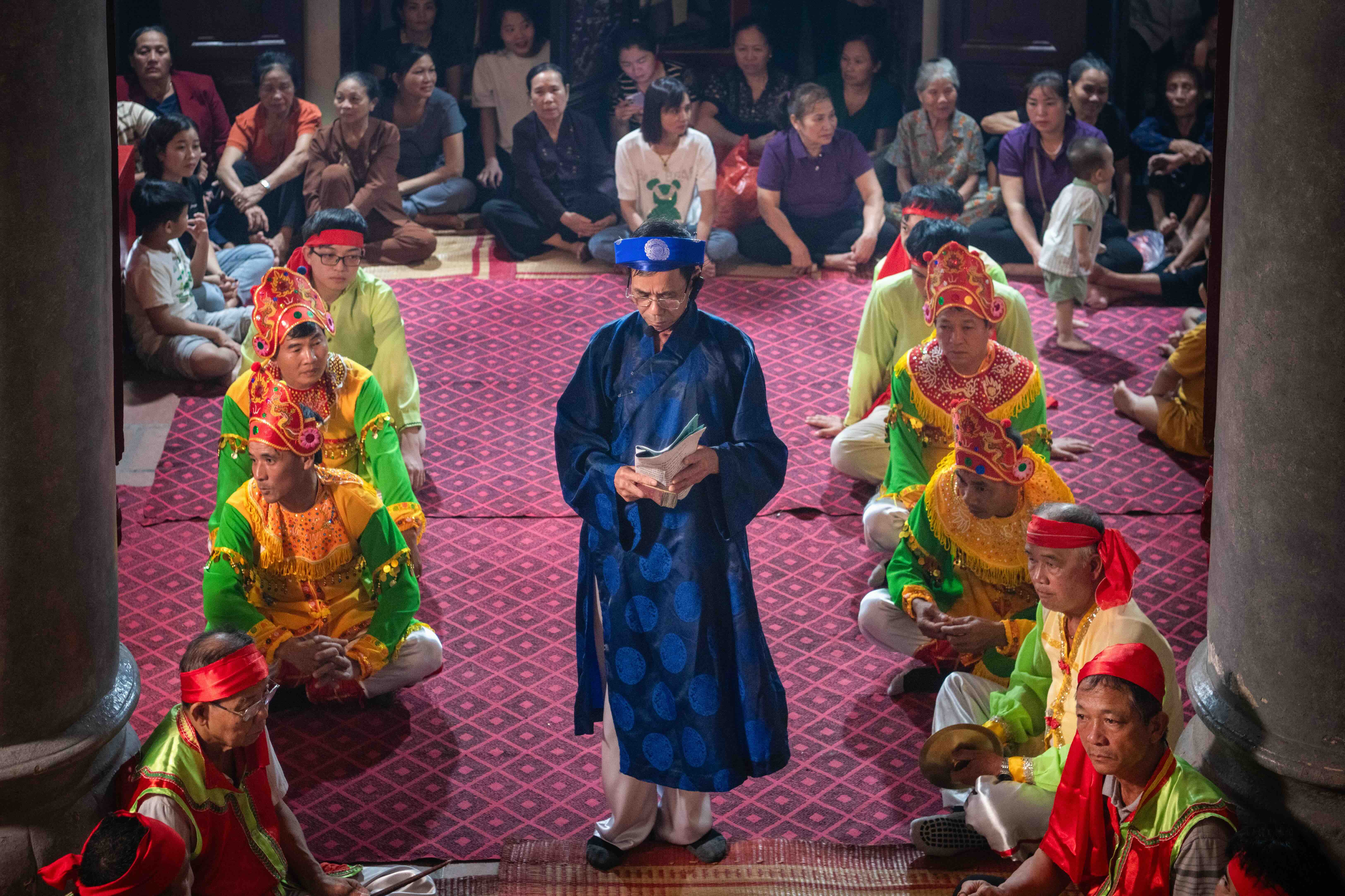 The accompanying music is entirely played on percussive instruments: two mo (wooden muyu) made from the base of bamboo culms; one trong ban (flat drum); two trong com (rice-paste drums); two thanh la (small gongs); one trong cai (grand drum) to mark time and cue melodic changes; one chuong dau (small ritual bell); and one trong thay boi (diviner’s drum) that follows the grand drum.