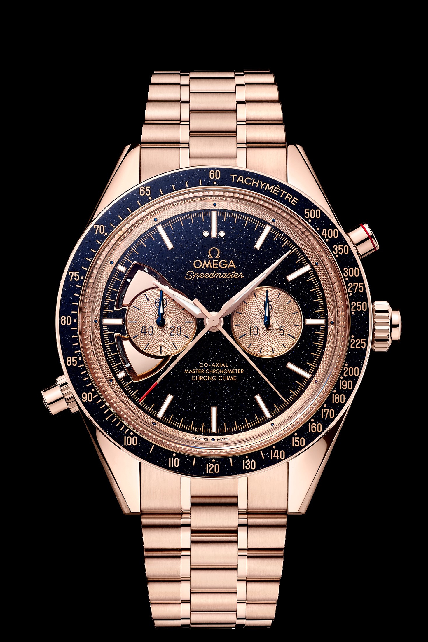 Although the movement is the same for both watches, the functional and decorative pushers are in different positions, with a chime at 8 o’clock and split seconds at 2 o’clock. For the Speedmaster, OMEGA’s ingenious watchmakers turned the calibre around to suit the configuration of the case and accommodate the two subdials. Completing the look is a bracelet and buckle in 18K Sedna™ Gold. Collectors of the Speedmaster will also receive the special walnut presentation box with resonance plate.