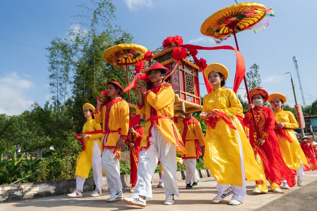 Lễ rước sắc (a ceremony to transport the ordinance that honors the goddess) begins on the afternoon of the 11 day of the second lunar month. The procession departs from th the house of the ordinance-keeper along the village’s main road, carrying imperial banners, five-color flags, command drums, dragon palanquins, and other decorations. Upon reaching the temple’s yard, the keeper carries the box containing the letter, places it on the main altar, and is in charge of guarding the box until the festival ends.