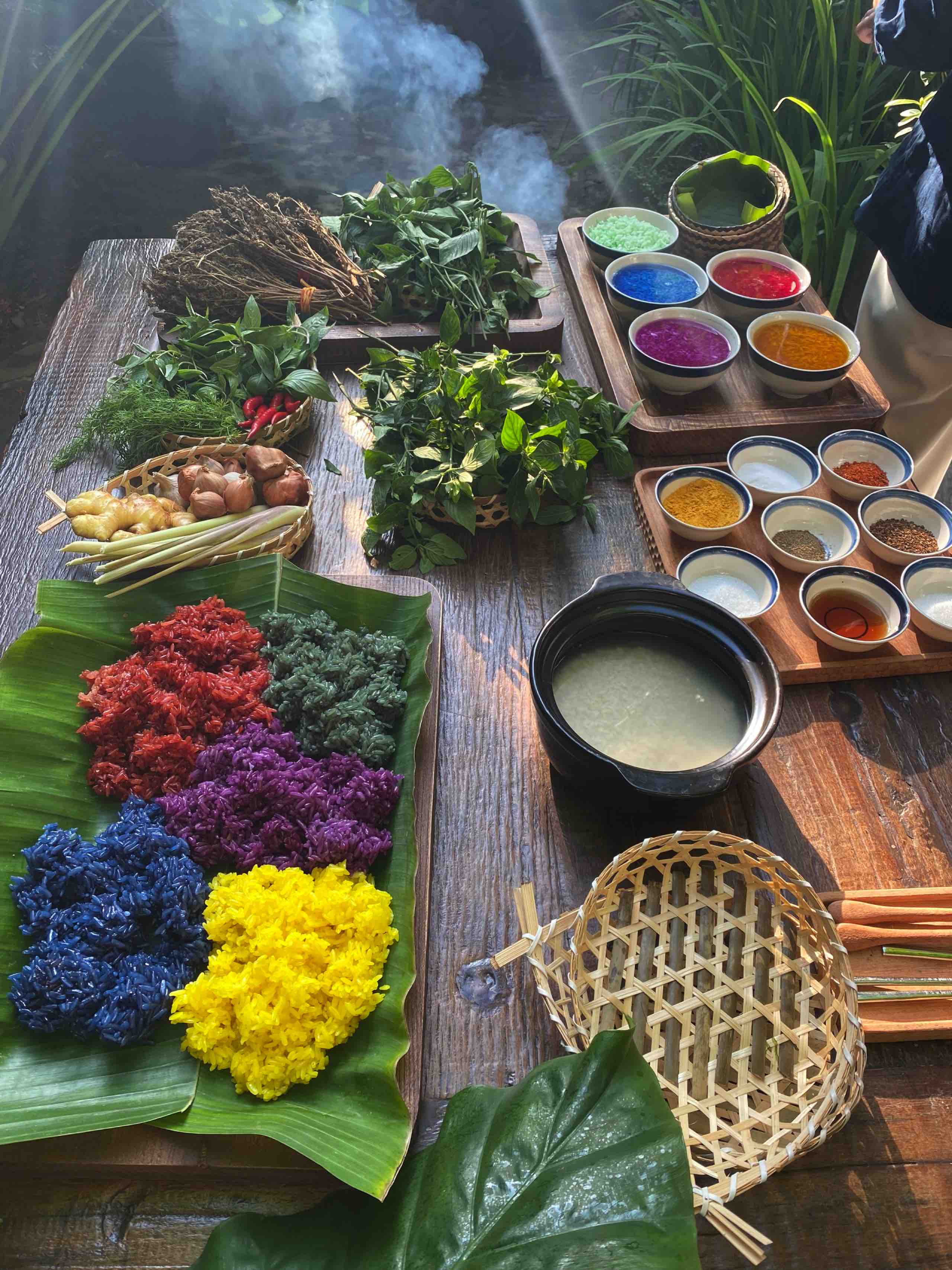 Duyên, Việt và Huyền đã mời và giới thiệu với chúng tôi những món ăn đầy bản sắc. Đó là món lạp (nộm da trâu) thơm nức nhờ nước ngâm măng; là pa pỉnh tộp (cá nướng) với gia vị nêm nếm rất khéo, cả hai đều là món của người Thái Tây Bắc; là thịt trâu khô cùng lòng lợn gác bếp đỏ hồng, thơm phức mà ngọt lịm, béo bùi; là xôi ngũ sắc làm từ nếp nương hạt dài, dẻo thơm có nguồn gốc từ Lào Cai.