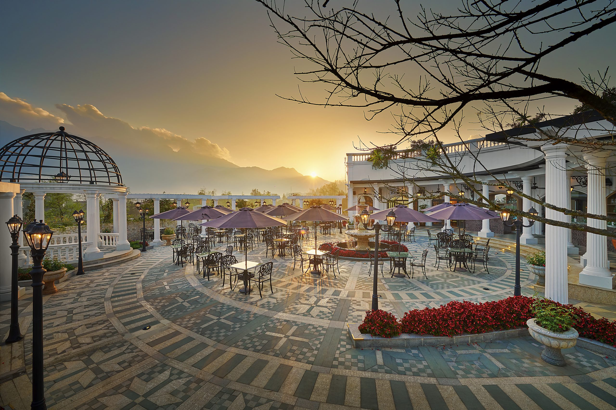 Men theo con đường đá dẫn lối vào các tòa nhà là khu vườn bốn mùa độc đáo, ẩn hiện sau chiếc cổng vòm duyên dáng, nơi cư ngụ của nhiều loài cây và hoa quý hiếm. Dù tiết trời Sa Pa đã chuyển lạnh, khu vườn vẫn như một mảnh trời riêng, kiêu kỳ khoe sắc với những cánh hồng rực rỡ tỏa hương. Hồng cổ Sa Pa nổi tiếng là giống hồng quý và lâu đời, biểu tượng cho sức sống mãnh liệt của vùng đất mờ sương.