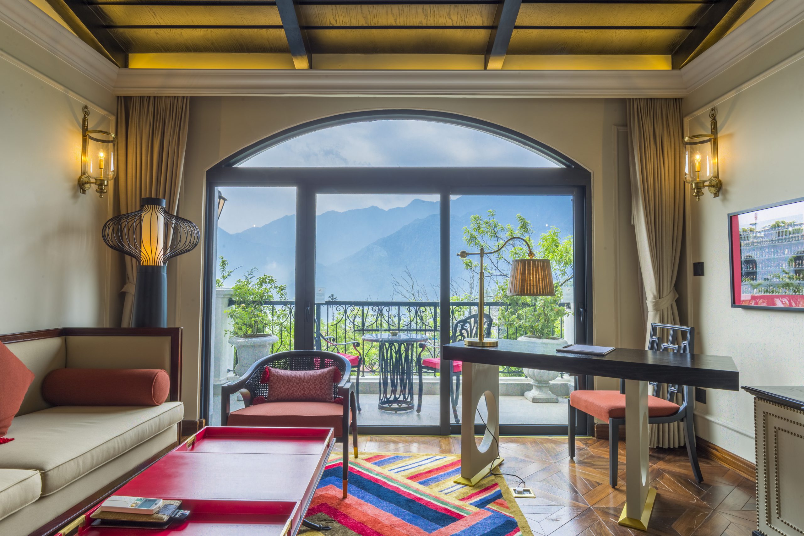 Không gian bên trong mang dấu ấn Đông Dương tinh tế, chấm phá bởi phong cách châu Âu hoài cổ sống động: trần cao, nội thất gỗ cầu kỳ, đèn chùm lớn làm từ vàng và đồng, bộ sưu tập các tác phẩm nghệ thuật đắt giá, những tấm vải thổ cẩm dệt tay khéo léo với hoa văn truyền thống của người H’Mông, Tày, Dao…