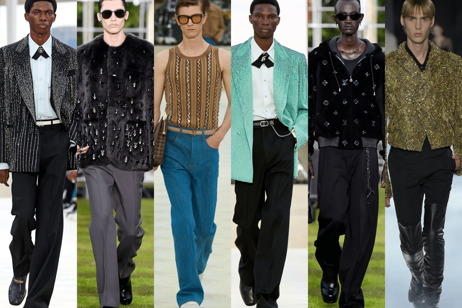 “Kim cương không chỉ là bạn thân của phái đẹp” – đó chính là thông điệp mà các nhà mốt muốn truyền tải qua xu hướng Diamond Heist mùa này. Pha lê, rhinestone và những viên đá quý xuất hiện khắp mọi nơi, từ áo khoác, blazer cho đến áo hoodie và phụ kiện. Nếu bạn chưa sẵn sàng để diện cả bộ suit lấp lánh, hãy bắt đầu với những chi tiết nhỏ như cà vạt, thắt lưng hoặc giày đính đá. Một chiếc áo sơ mi với họa tiết rhinestone hoặc blazer ánh kim cũng là lựa chọn táo bạo nhưng không quá phô trương.