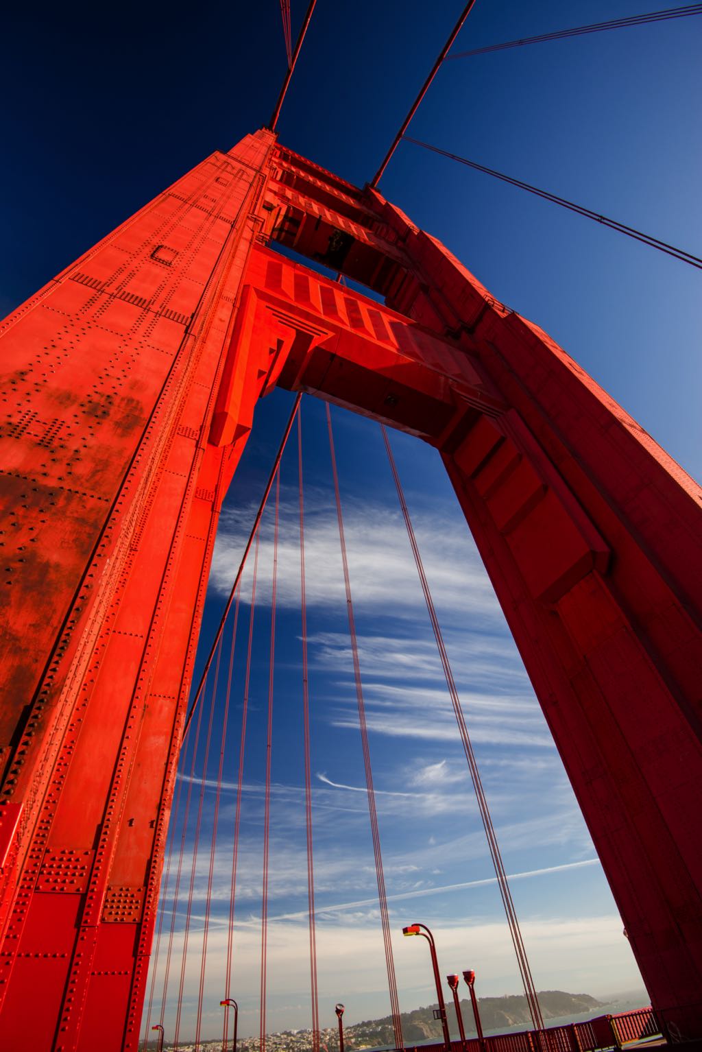 Thăm cầu Golden Gate nên bắt đầu thực hiện lúc sáng sớm, xuyên qua công viên Presidio nằm dọc theo bờ biển. Đó là một hành trình thú vị men theo các vách đá cheo leo và thỏa sức ngắm nhìn cây cầu từ nhiều góc độ khác nhau trước khi đến gần nó, và không gì tuyệt vời hơn khi chứng kiến cây cầu huyền thoại chìm trong sương mù huyền bí và phảng phất chút gì đó thật mơ hồ. Cây cầu sẽ lộ ra từng khúc, từng khúc khi mặt trời nhô lên để rồi cuối cùng rực rỡ trong ánh nắng chan hòa, trên nền nước biển xanh ngắt. Sở dĩ cây cầu được các kiến trúc sư chọn màu da cam lai đỏ thật đặc biệt vì nó rất “ăn” với màu các dải đất ở hai phía đầu cầu. San Francisco thường xuyên bị sương mù bao phủ, màu da cam sẽ giúp người đi đường quan sát tốt hơn.