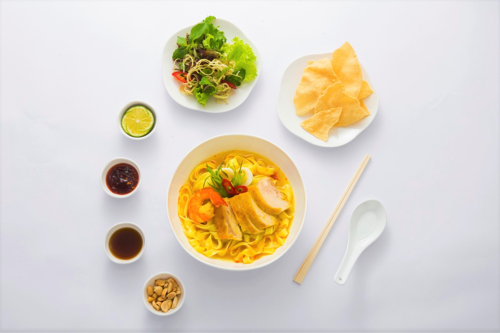 Ngay giữa những tầng mây, hành khách Thương gia sẽ được thưởng thức những món ăn nổi tiếng từ Bắc chí Nam như bún chả Hà Nội, bánh mỳ sốt vang, bún bò Huế, mỳ Quảng, bún trộn thịt nướng, hủ tiếu Mỹ Tho…