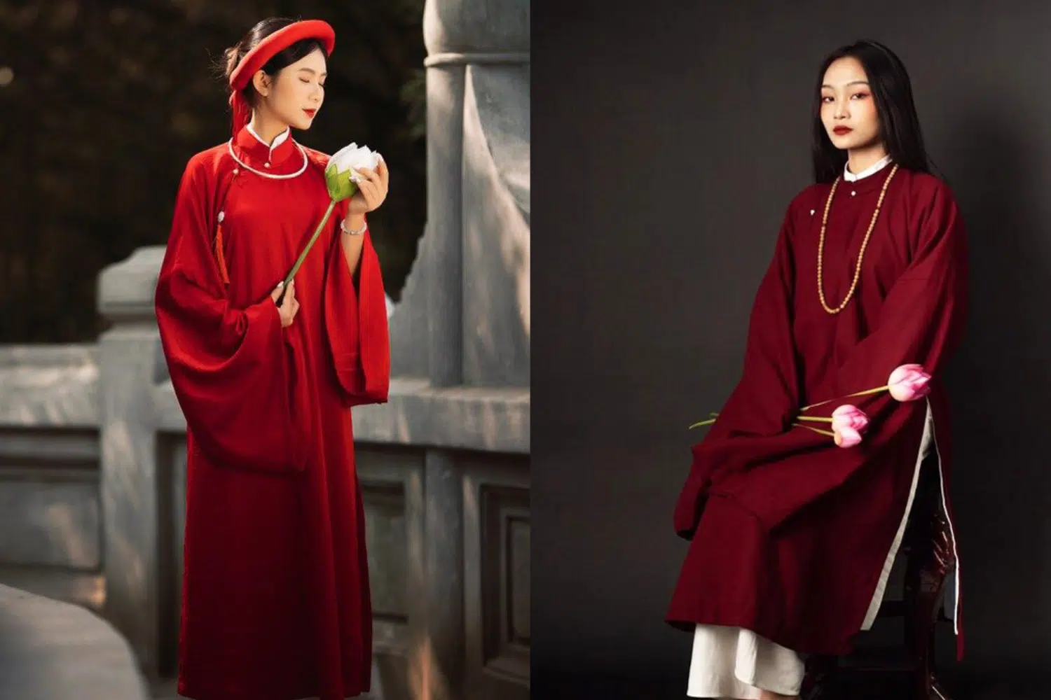 - Áo dài cách tân: Có thể có tà ngắn hơn, cổ thấp hoặc không cổ, tay áo biến tấu linh hoạt, kết hợp cùng váy hoặc quần culottes thay vì quần lụa truyền thống.