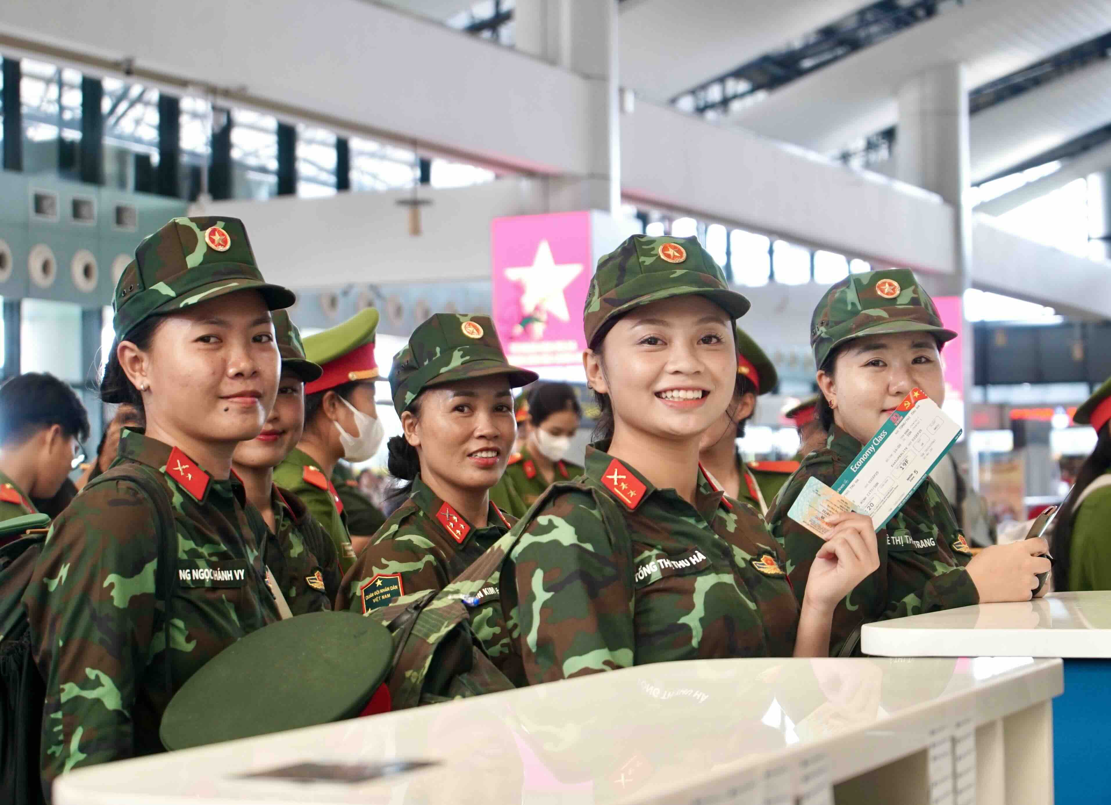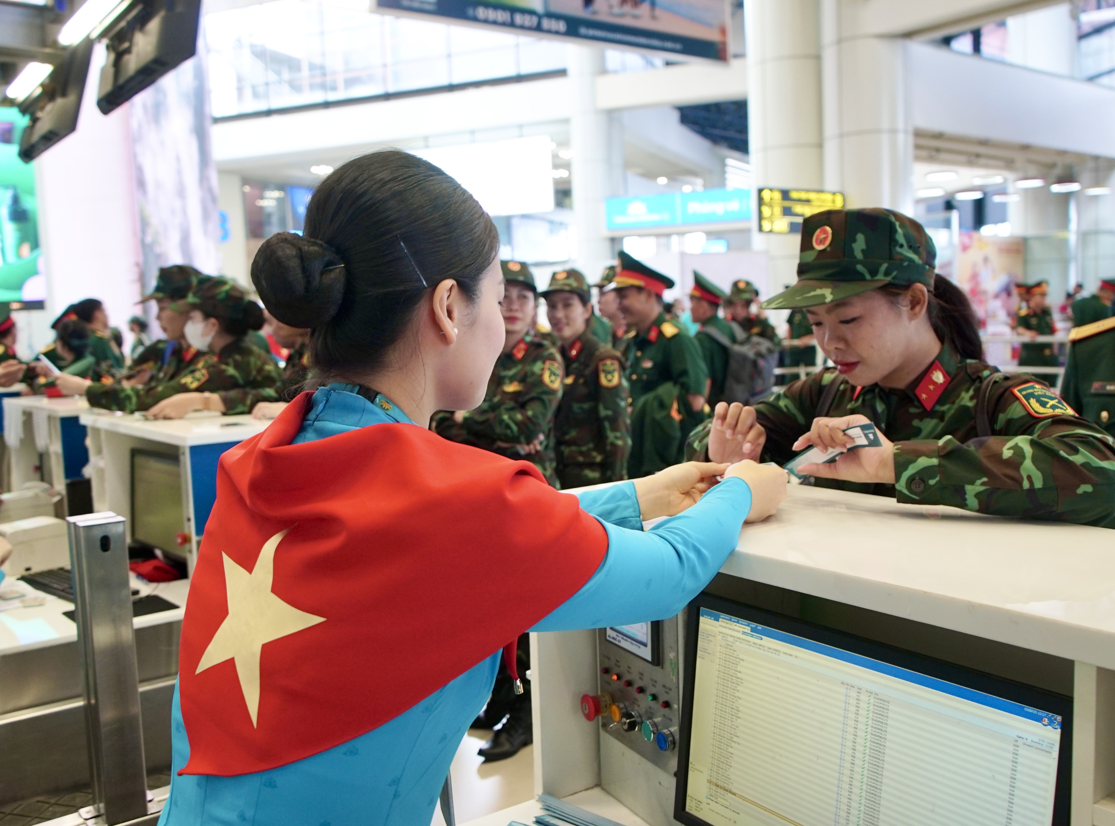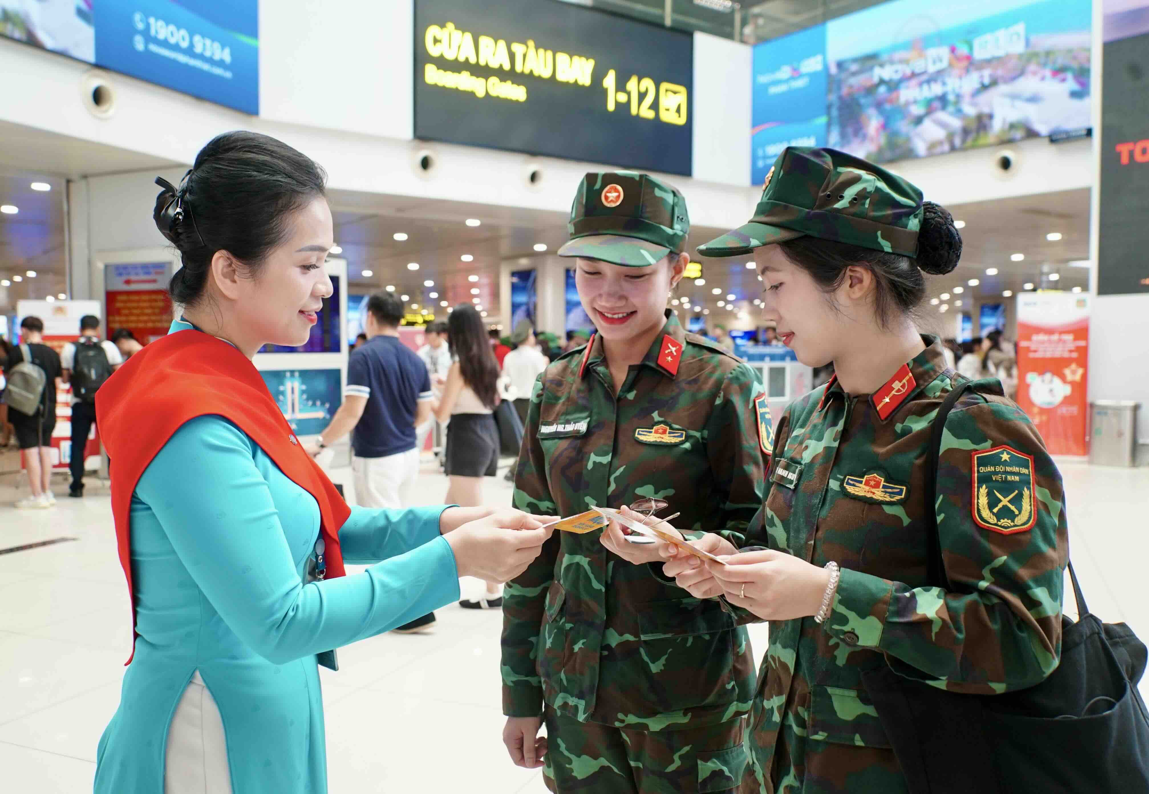Tại đây, các chiến sĩ được nhân viên của Vietnam Airlines hướng dẫn làm thủ tục để lên chuyến bay VN9213 cất cánh lúc 14h00 ngày 3/9.