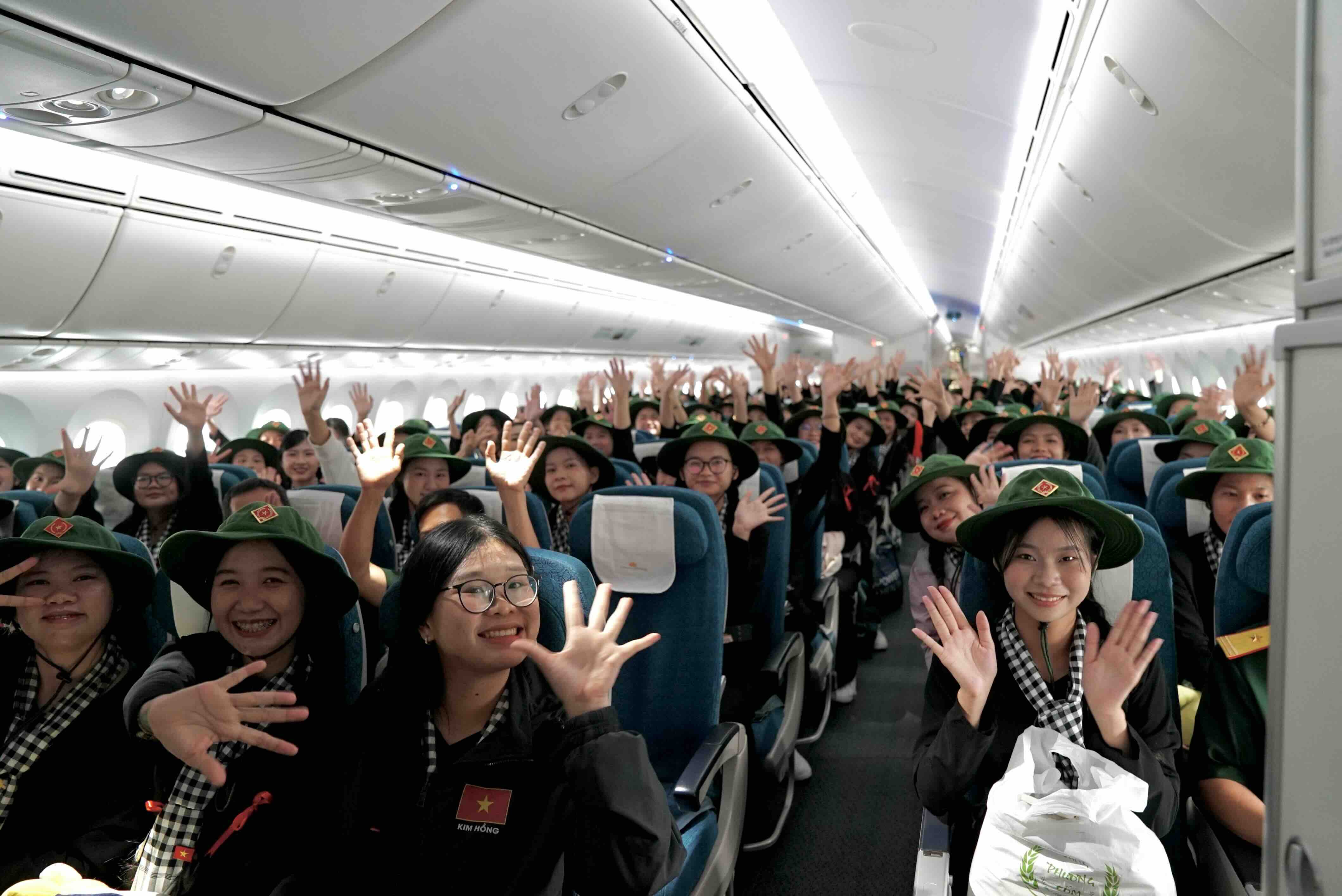 Trên chuyến bay, các tiếp viên của Vietnam Airlines cài huy hiệu cờ đỏ sao vàng trên ngực áo, mang theo sắc màu Tổ quốc trong không gian khoang bay. Hình ảnh ấy hòa chung vào không khí trang trọng của hành trình, như một lời cảm ơn gửi đến các chiến sĩ đã hoàn thành xuất sắc nhiệm vụ và trở về trong niềm tự hào.