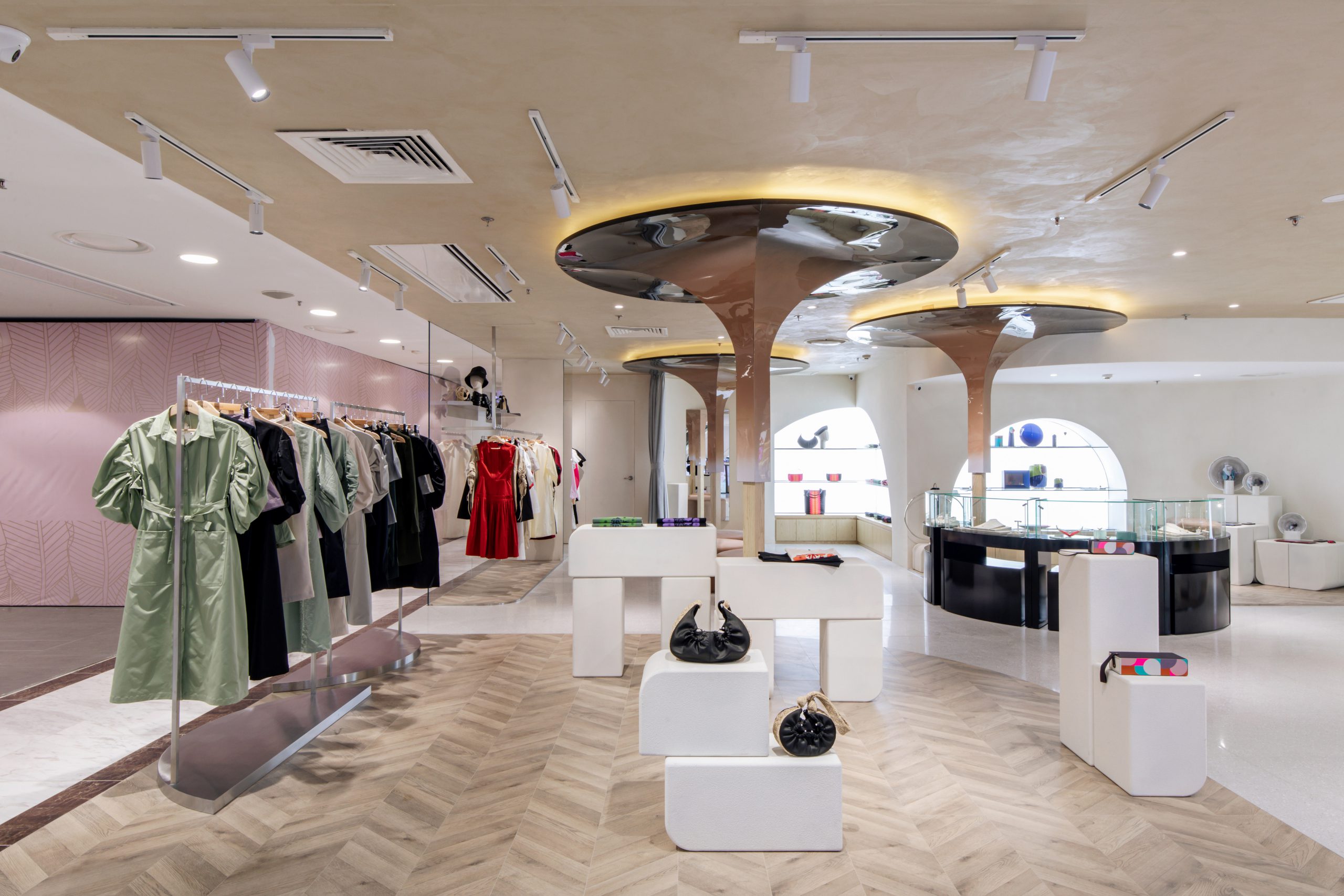 Tọa lạc tại tầng 2 TTTM Diamond Plaza – một trong những điểm mua sắm sầm uất nhất TP. Hồ Chí Minh, cửa hàng flagship mới của Hanoia được thiết kế bởi kiến trúc sư Hoàng Lê Hà của công ty Shapeus Studio. Điểm nhấn của cửa hàng là những chiếc cột sơn mài mô phỏng hình ảnh của cây sơn một cách sáng tạo, theo cách riêng của những nghệ nhân sơn mài tại Hanoia. Sự phóng khoáng trong cách sắp đặt cũng như các đường nét chi tiết và màu sắc mềm mại xuyên suốt cửa hàng tạo nên một tổng thể không gian rất trẻ trung và tươi mới.