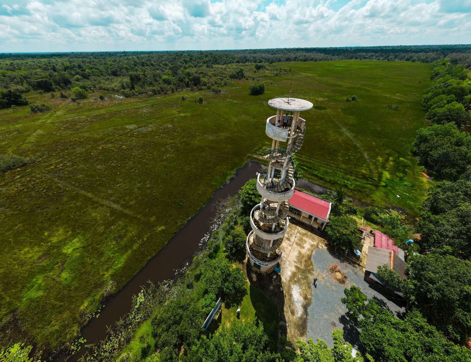 Tôi chẳng muốn rời đi nhưng chị Mai mỉm cười nói: Đi thôi, phía trước sẽ là một Đồng Tháp Mười thu nhỏ nơi đây. Xe cứ lao vun vút trên con đường đất đỏ ngập lá vàng, rồi dừng lại tại một tháp canh cao vút. Tôi leo lên đỉnh và ngỡ ngàng với không gian xanh bao la hiện trước mắt. Phía sau lưng chính là vương quốc Cambodia với những cây thốt nốt chọc thẳng lên trời, còn phía ngược lại là những cánh rừng tràm cùng những trảng cỏ ngập nước mênh mông đậm chất đất phương Nam. Toàn bộ diện tích mặt nước khoảng 4.000 ha với nhiều trảng nối tiếp nhau: Tà Nốt, Tân Thanh, Bà Điếc, bàu Đưng Lớn… Chính những trảng cỏ ngập nước này là thiên đường cho các loài cá, thú ăn cỏ và chim di cư từ khắp nơi bay về.
