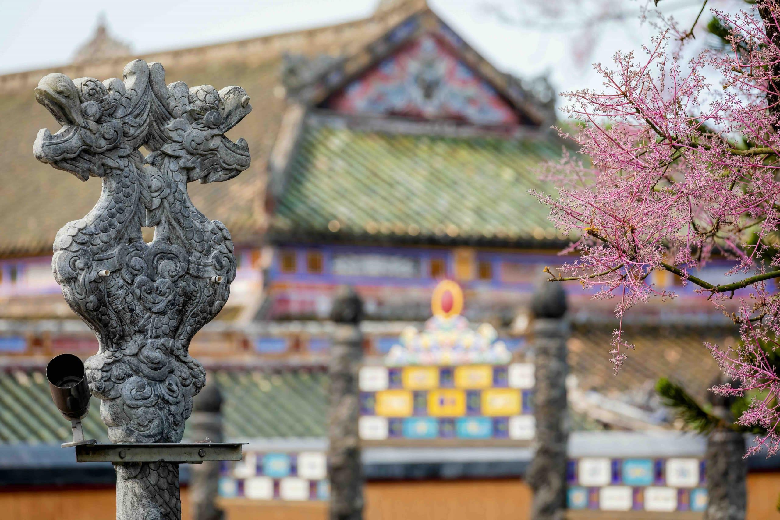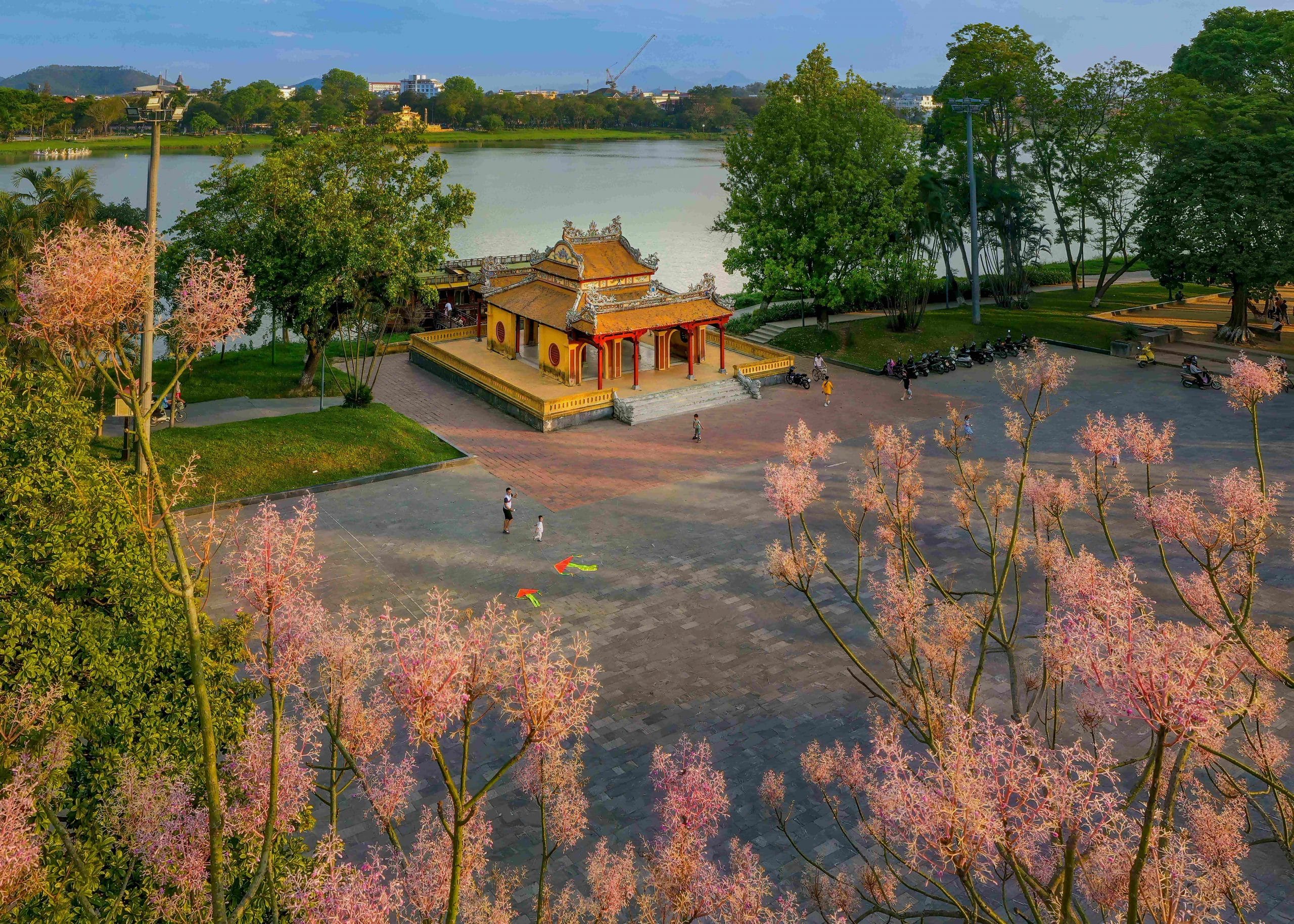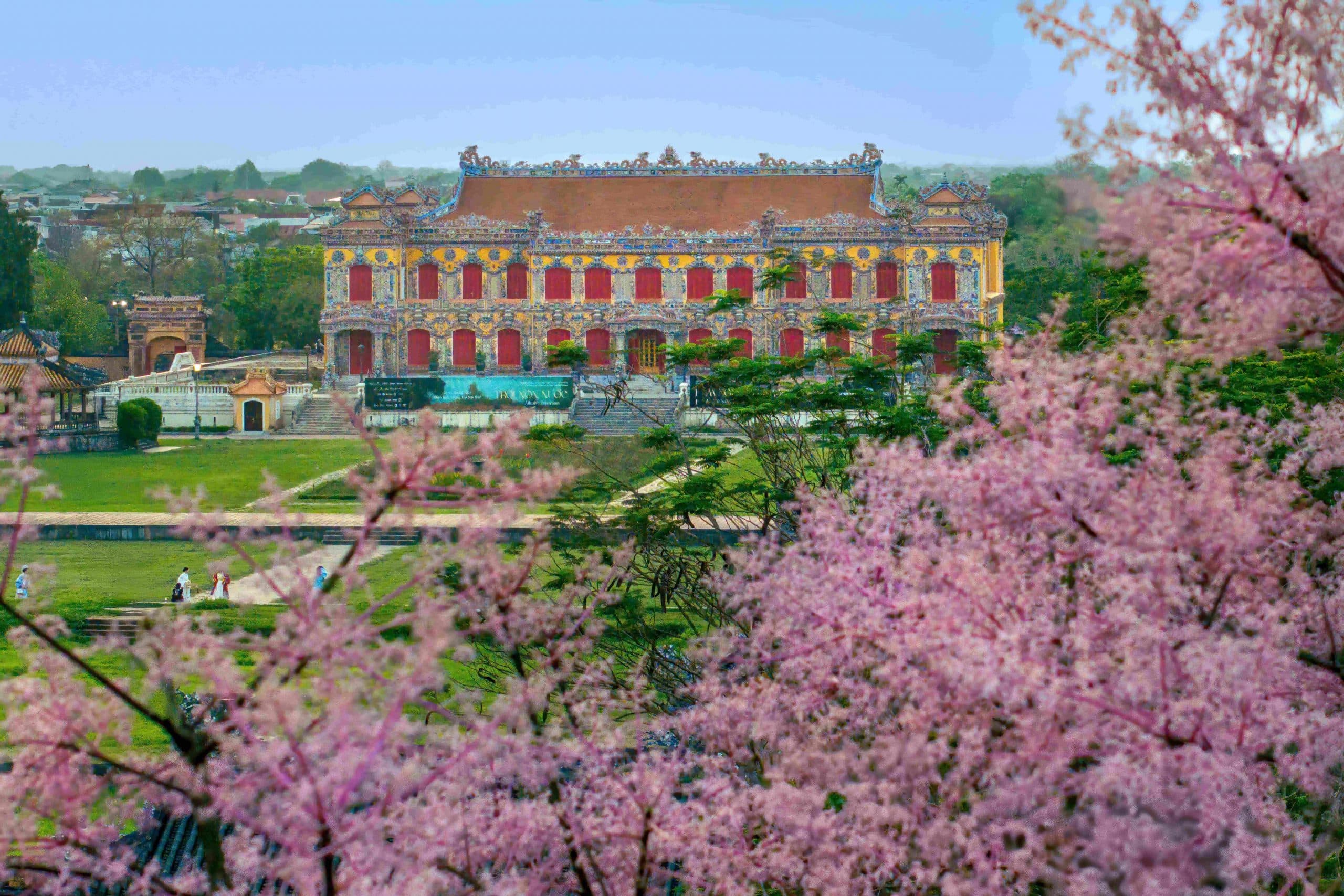 Từ góc nhìn khác còn có thể thấy sắc hoa ngô đồng tô thắm trên nền trời xanh, bên những công trình kiến trúc cổ xưa làm rực rỡ thêm cho khung cảnh Đại Nội. Những cây ngô đồng này vươn cao, nhưng thanh thoát nên không lấn át các công trình mà đem lại màu sắc mới lạ đầy cuốn hút cho kiến trúc và vẻ thâm trầm nơi đây.