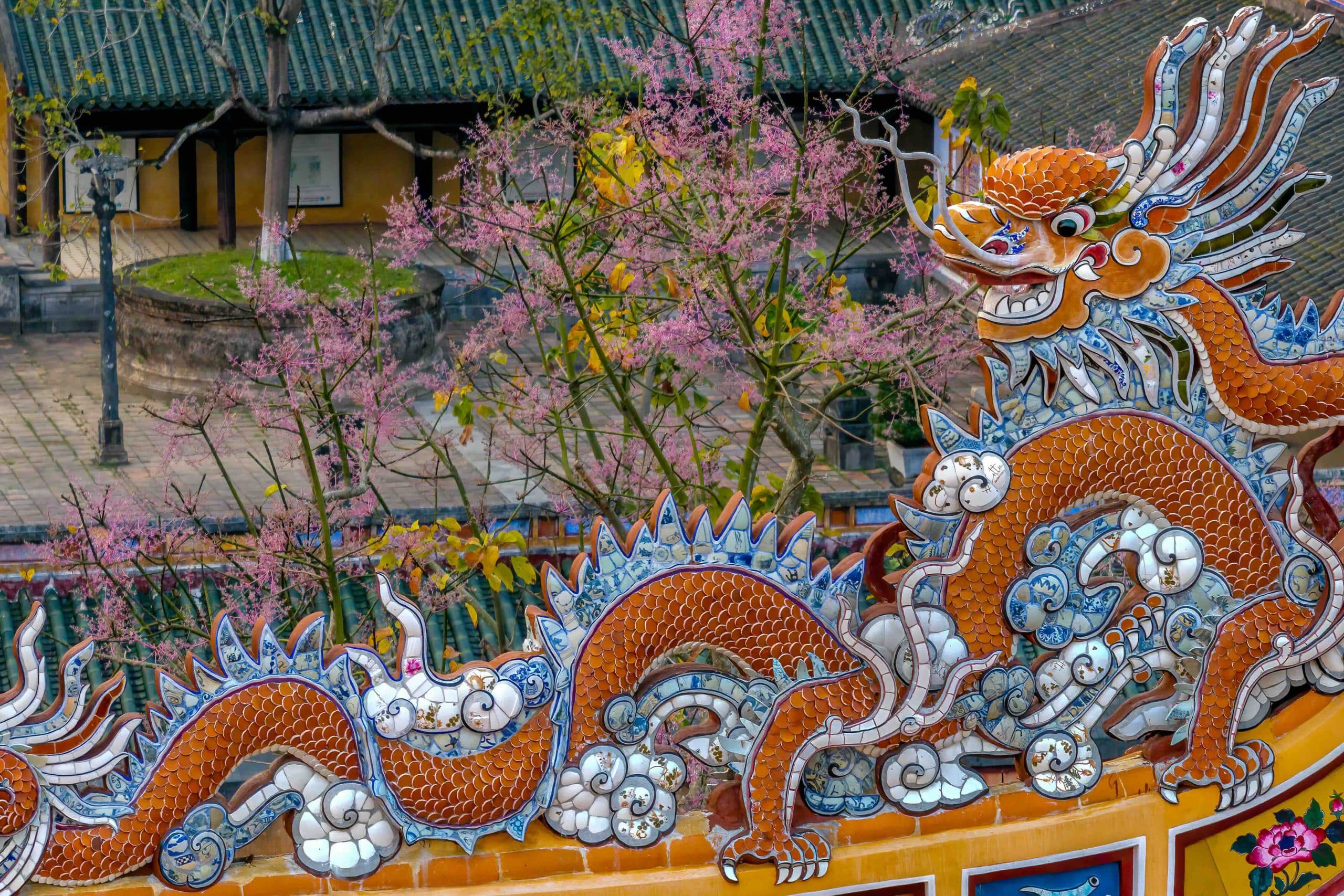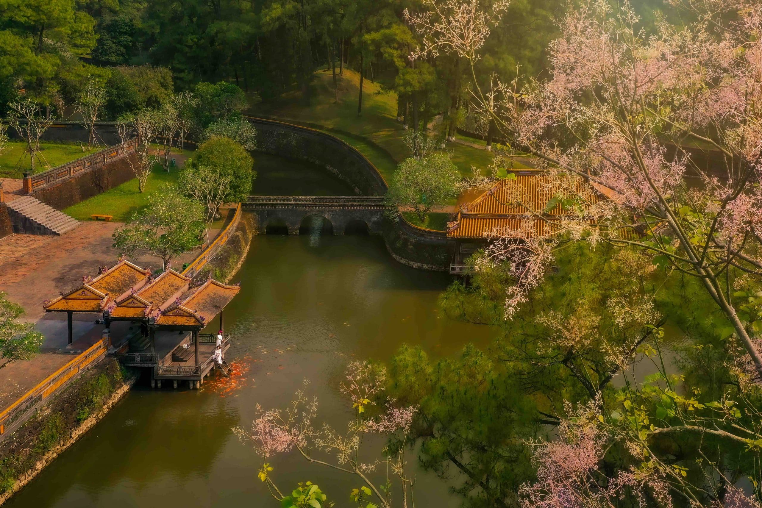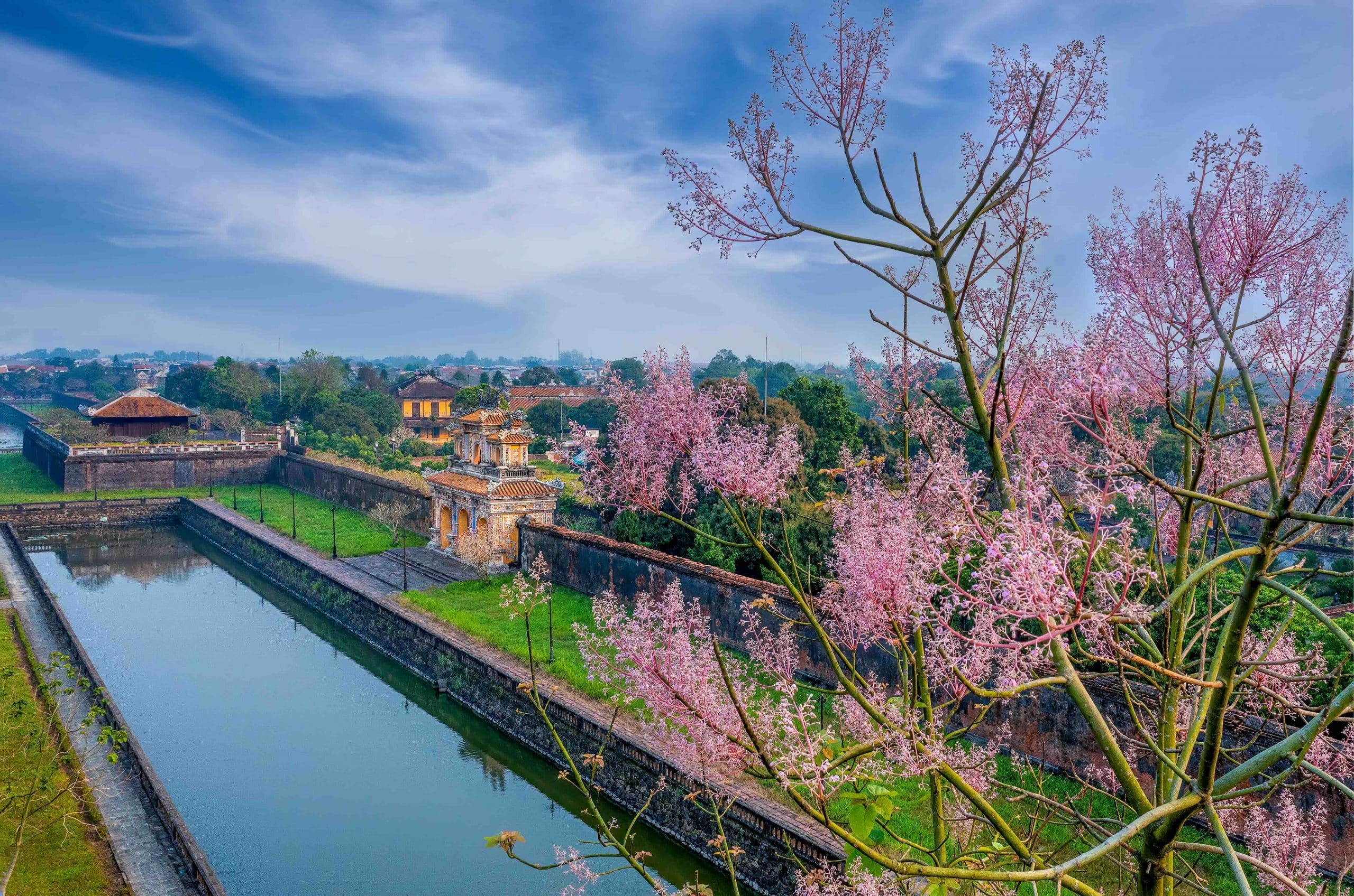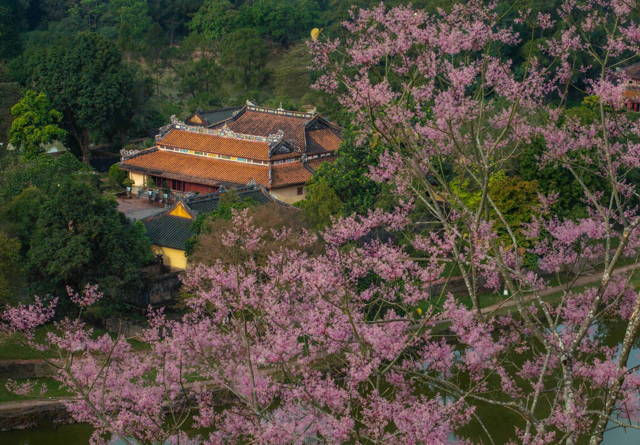 Từ góc nhìn khác còn có thể thấy sắc hoa ngô đồng tô thắm trên nền trời xanh, bên những công trình kiến trúc cổ xưa làm rực rỡ thêm cho khung cảnh Đại Nội. Những cây ngô đồng này vươn cao, nhưng thanh thoát nên không lấn át các công trình mà đem lại màu sắc mới lạ đầy cuốn hút cho kiến trúc và vẻ thâm trầm nơi đây.