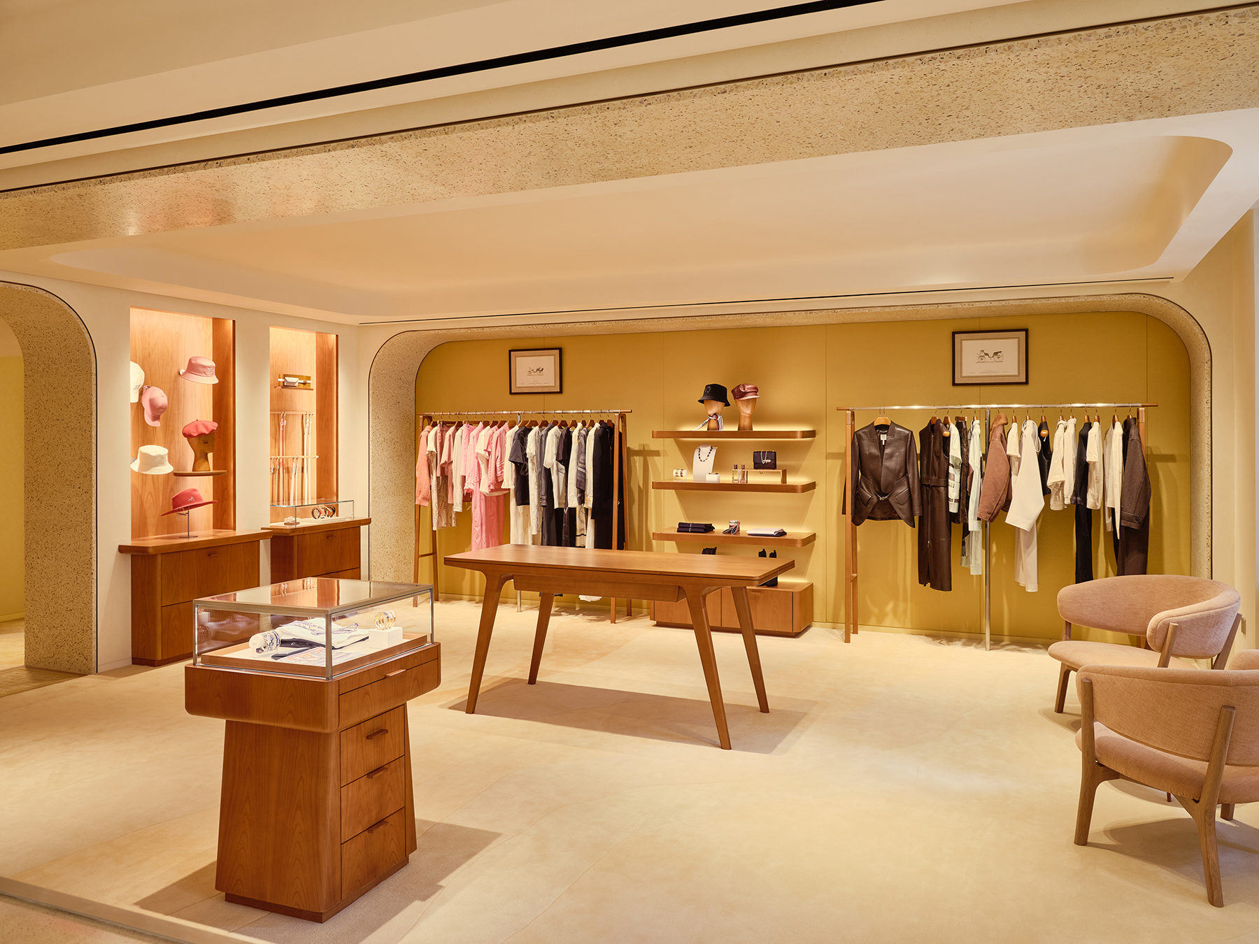 Các bộ sưu tập đồ da và đồ cưỡi ngựa được sắp đặt trong không gian ấm cúng phía sâu bên trong, kết nối với khu vực đồ trưng bày không gian sống. Cầu thang trung tâm sử dụng mây đan thủ công kết hợp lan can kim loại mạ vàng và da, tôn vinh vẻ đẹp của nghệ thuật thủ công. Khu trưng bày trang sức và đồng hồ được làm nổi bật bằng thảm họa tiết ombre lấy cảm hứng từ ruộng bậc thang, dẫn lối đến khu giày và trang phục may sẵn với bảng màu chuyển sắc từ xanh lá sang vàng.