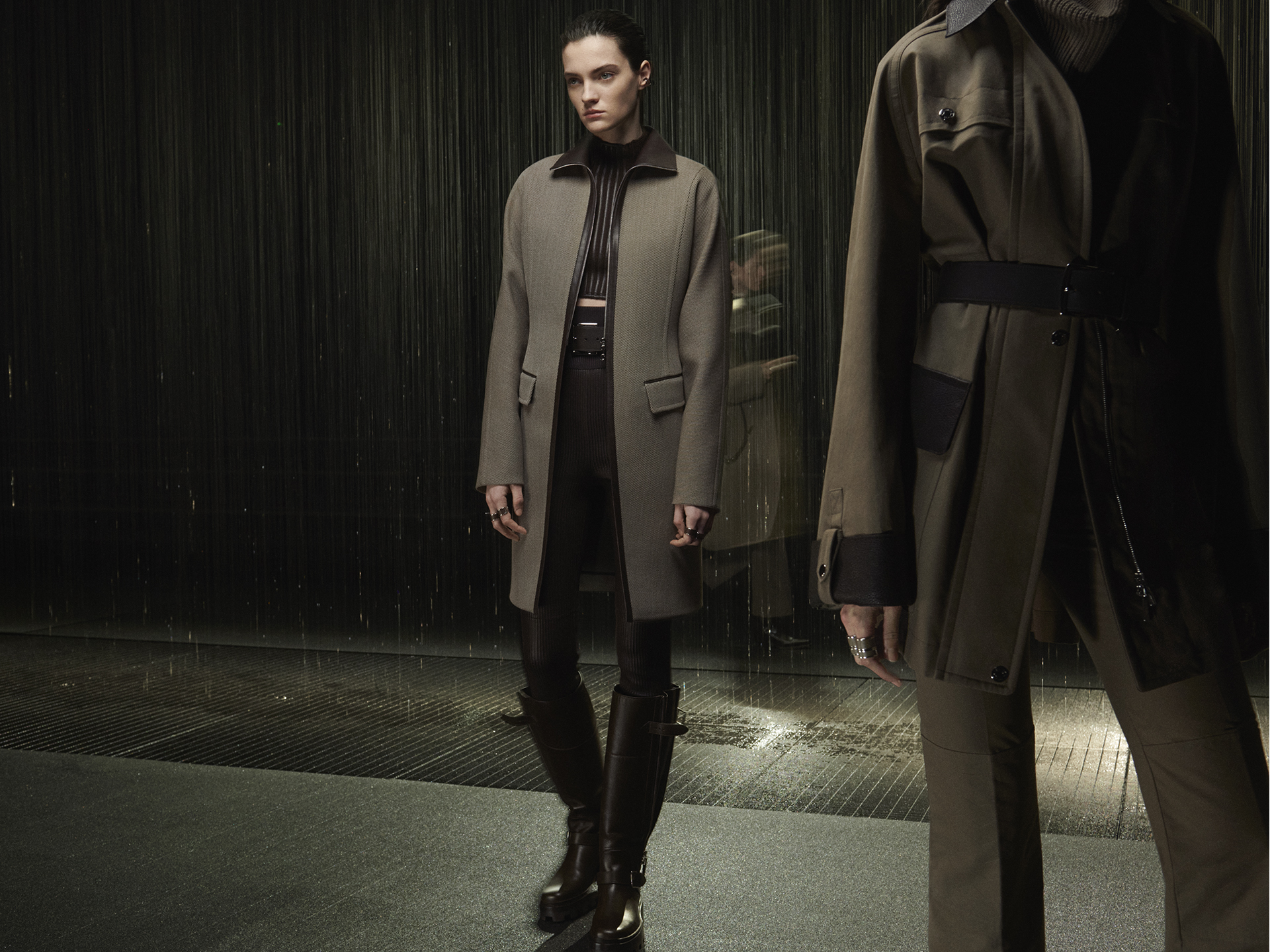 Dưới mưa lạnh và đèn đường hiu hắt, dàn mẫu quyết liệt bước đi, đem theo tầm nhìn thẩm mỹ mới của Hermès bước vào mùa Thu/Đông 2024.
