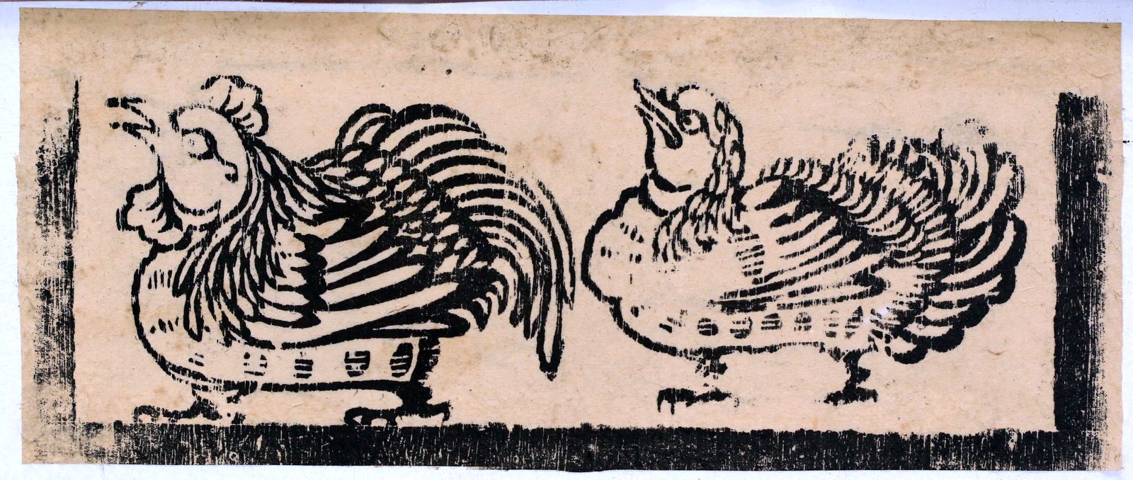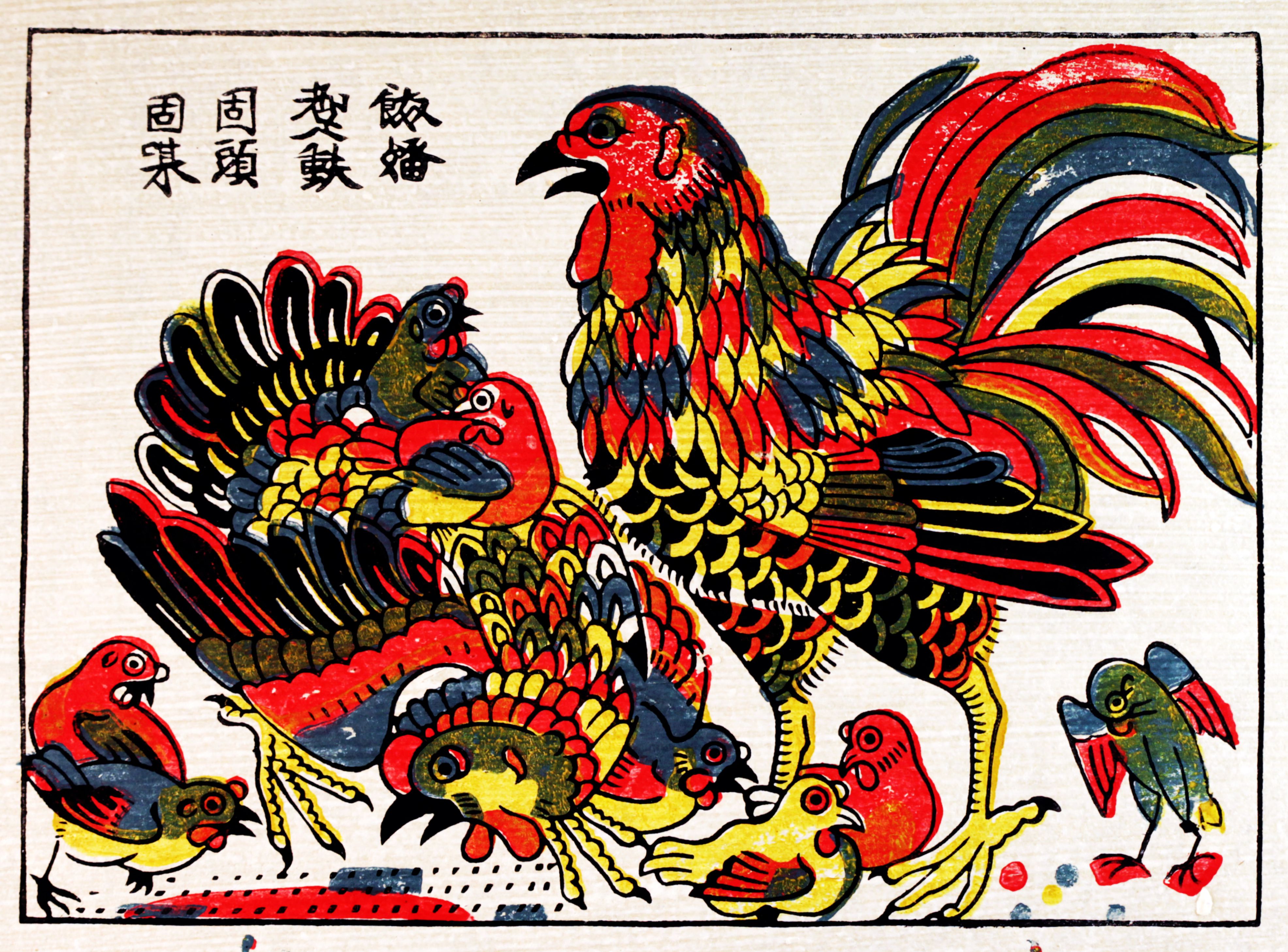 Đến một thời điểm cách đây vài trăm năm, gà đã là biểu tượng của sự vinh hoa, no ấm. Dường như các dòng tranh dân gian chủ yếu đều có tranh gà: tranh Đông Hồ, Kim Hoàng, Hàng Trống, Làng Sình… Có lẽ đẹp nhất là bức tranh chú bé đang cưỡi con gà trống được đề hai chữ Hán “Vinh Hoa”. Tác giả vô danh của dòng tranh Đông Hồ đã khéo tạo ra một hình tượng thanh bình, no đủ mà người dân quê nào cũng mong muốn: “con cái mạnh khỏe, gà qué đầy vườn”. Cái đẹp của bức tranh Đông Hồ này ở chỗ đề tài dân dã, cách sử dụng các mầu “gốc” đôi chút sặc sỡ và thủ pháp vẽ đường viền màu đen rõ rệt kết hợp với các cặp màu đối lập, đúng như họa sĩ người Pháp, ông Henri Oger cách đây hơn một thế kỷ đã nhận xét về tranh Đông Hồ: “Tranh dân gian An Nam được trình bày dưới dạng tập hợp các màu mạnh, tương phản. Qua những bức tranh này, người ta nhận ra sự ưa chuộng các màu sặc sỡ” (Sách Kỹ thuật của người An Nam xuất bản năm 1909). Cũng không kém nổi tiếng như bức tranh “Vinh Hoa”, bức tranh gà có đề hai chữ “Đại Cát” miêu tả một con gà trống đang ngậm mồi, trên lưng và xung quanh là đàn gà gồm 10 con gợi đến sự xum vầy, đầm ấm.
