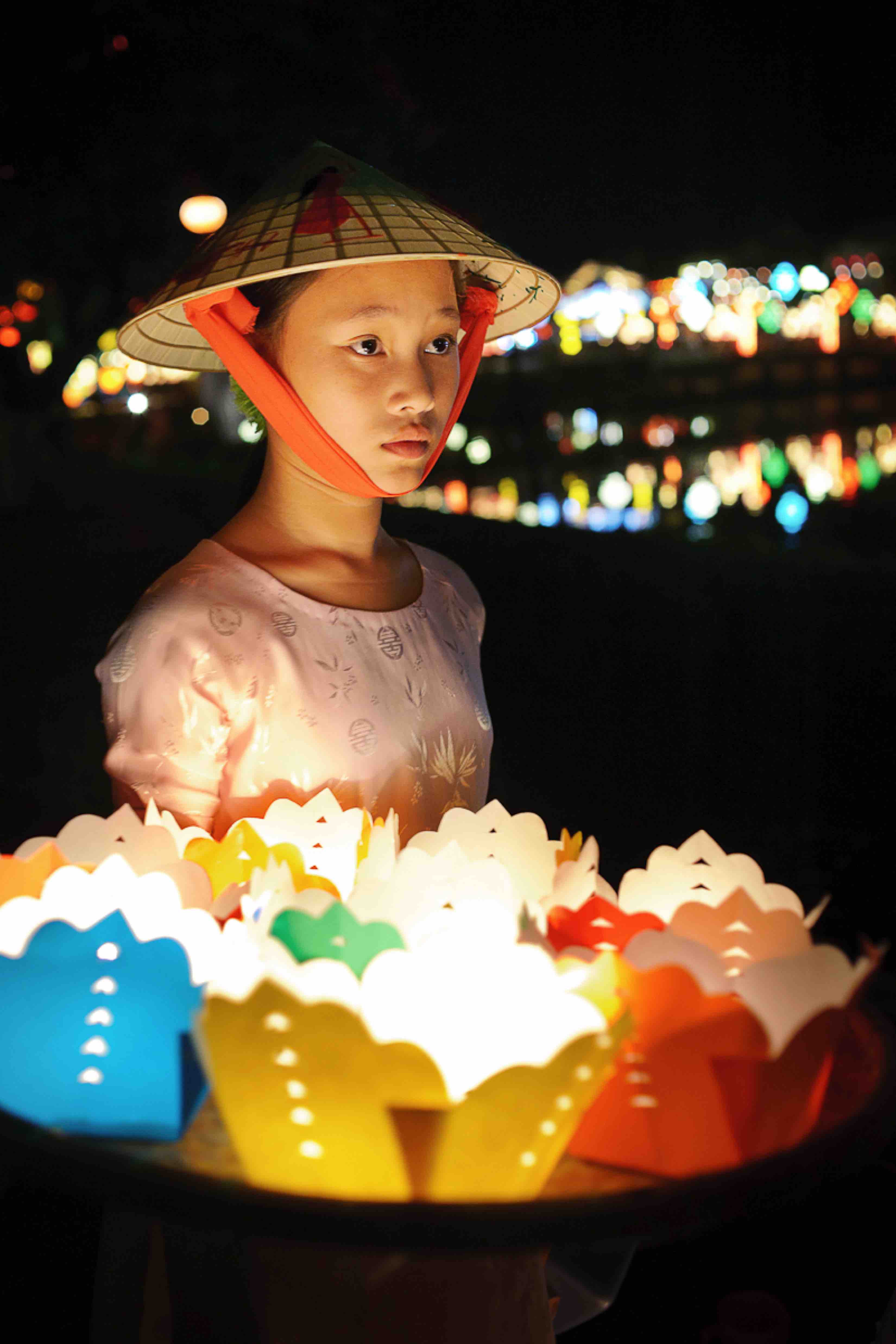 Chắc chỉ có ở phố Hội, từng con phố, dàn hoa giấy cho đến gánh hàng rong cũng khiến du khách xiêu lòng. Vậy nên khi bất giác nghe lời mời chào của một cô cậu bé, một cụ bà bán hoa đăng, “thả đèn cầu ước đi ạ”. Nhìn xuống chiếc mẹt nhỏ, những cánh hoa đăng được cắt khéo léo, xếp thật gọn, người du khách hẳn sẽ mềm lòng bởi vẻ đẹp quá đỗi mộc mạc từ con người đến chiếc đèn hoa.
