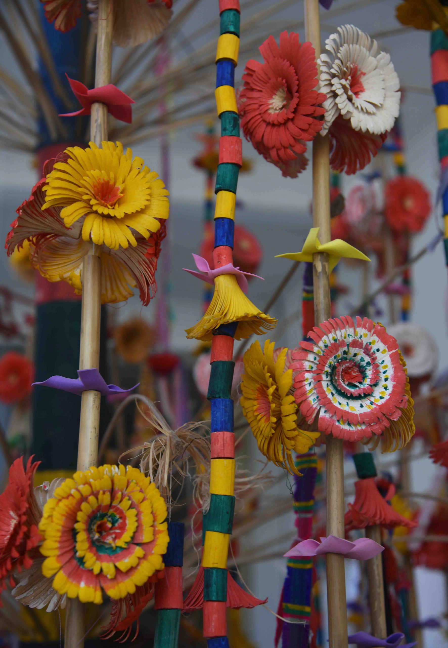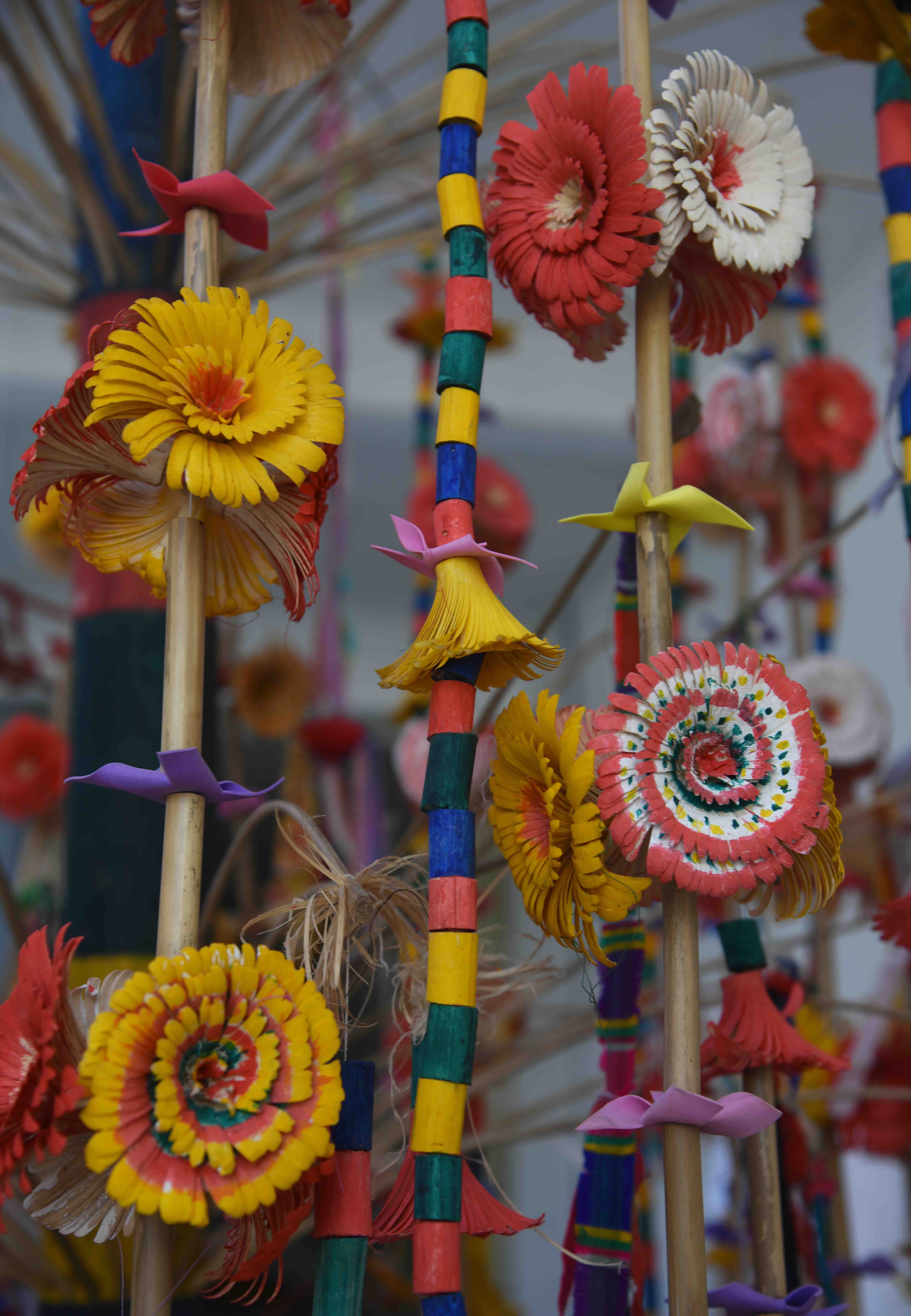 Cây bông của các dân tộc Thái, Mường, Tày, Nùng… là một công trình nghệ thuật rất kỳ công. Để làm được cây bông có 5 tầng với hàng nghìn bông hoa, bà con phải mất gần một tháng trời đi vào rừng tìm các loại cây về để chế tác. Họ vào rừng, lên rẫy tìm cành cây dâu, cây sắn, cây chục bục để làm cành và gọt tỉa những bông hoa. Hoa cây bông được làm bằng gỗ cây chạng vạng, ruột cây và thân cây bông làm bằng luồng già. Trong một cành có nhân bông, gồm các đốt và nhiều hoa màu sắc. Ở mỗi đầu cành đều được trang trí hình chim, ngoài ra còn có những vật dụng lao động sản xuất như cày, bừa, vật nuôi như trâu, bò… làm bằng tre nứa và những quả còn ngũ sắc. Cây bông đẹp nhờ sự khéo tay của bà con dân làng. Bông có hình dạng giống như bông đồng tiền. Sau khi gọt tỉa thành bông, bà con mang đi nhuộm màu bằng nhựa cây, đồ chín, phơi khô rồi xâu thành sợi.