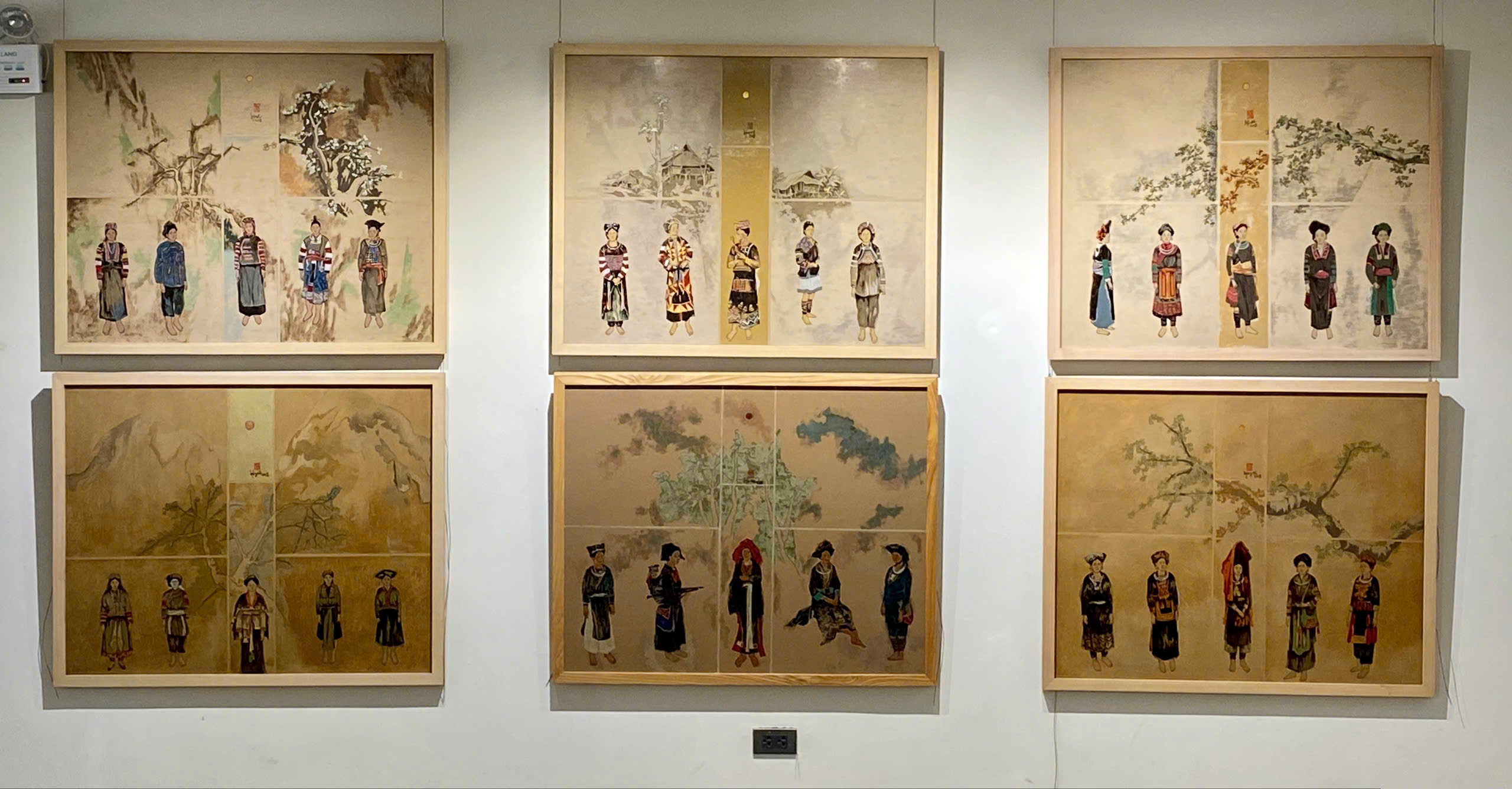 Bên cạnh đó, họa sỹ Đỗ Đức còn giới thiệu bộ tranh “Sắc phục các dân tộc thiểu số miền núi phía Bắc” gồm 11 tác phẩm, khắc họa trang phục truyền thống của các dân tộc như H’Mông, Dao, Lô Lô… gắn với không gian sống và bản sắc văn hóa đặc trưng, mang giá trị văn hóa – di sản và dân tộc học rõ nét.