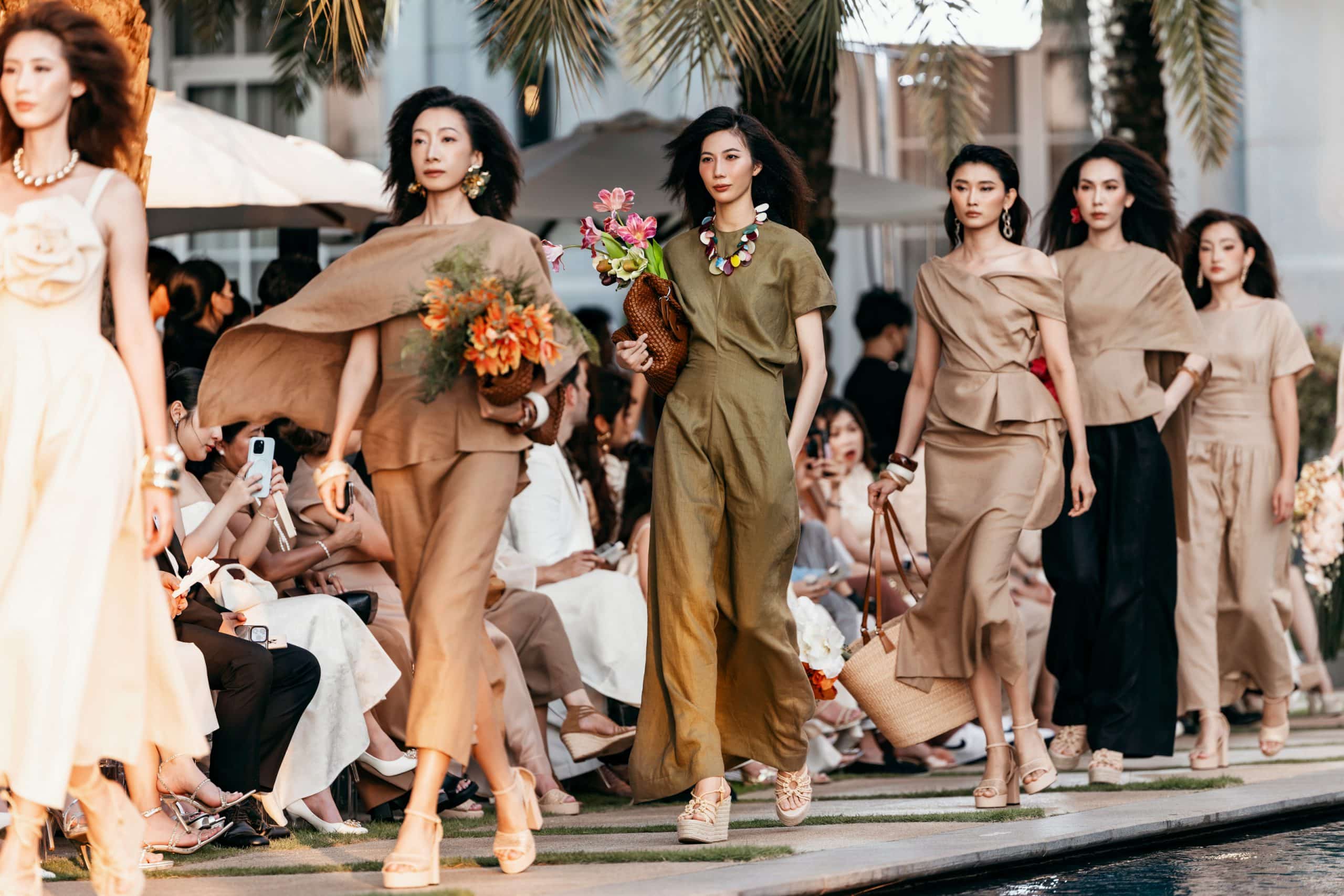 Bảng màu đa dạng với các tông nâu, be chủ đạo, cùng xanh đen, trắng, hồng, nâu cam, được nhà thiết kế sử dụng tài tình để tạo nên sự thú vị và mới mẻ cho từng thiết kế. Đặc biệt, các thiết kế đơn sắc được chú trọng vào đường may và tạo khối, kết hợp cùng phụ kiện mây, tre, đan, giày cói, mang đến một làn gió thời trang ứng dụng cao cho mùa hè sắp tới.