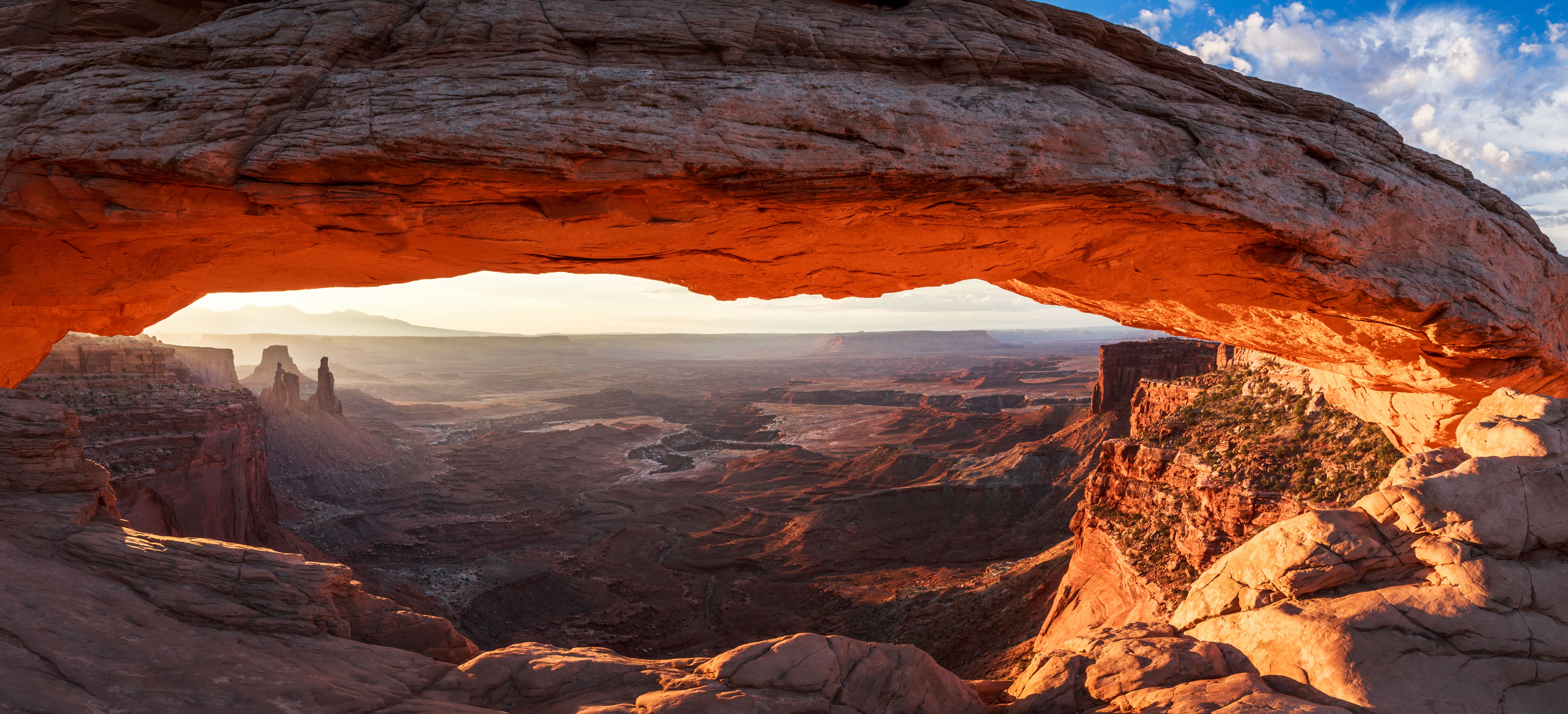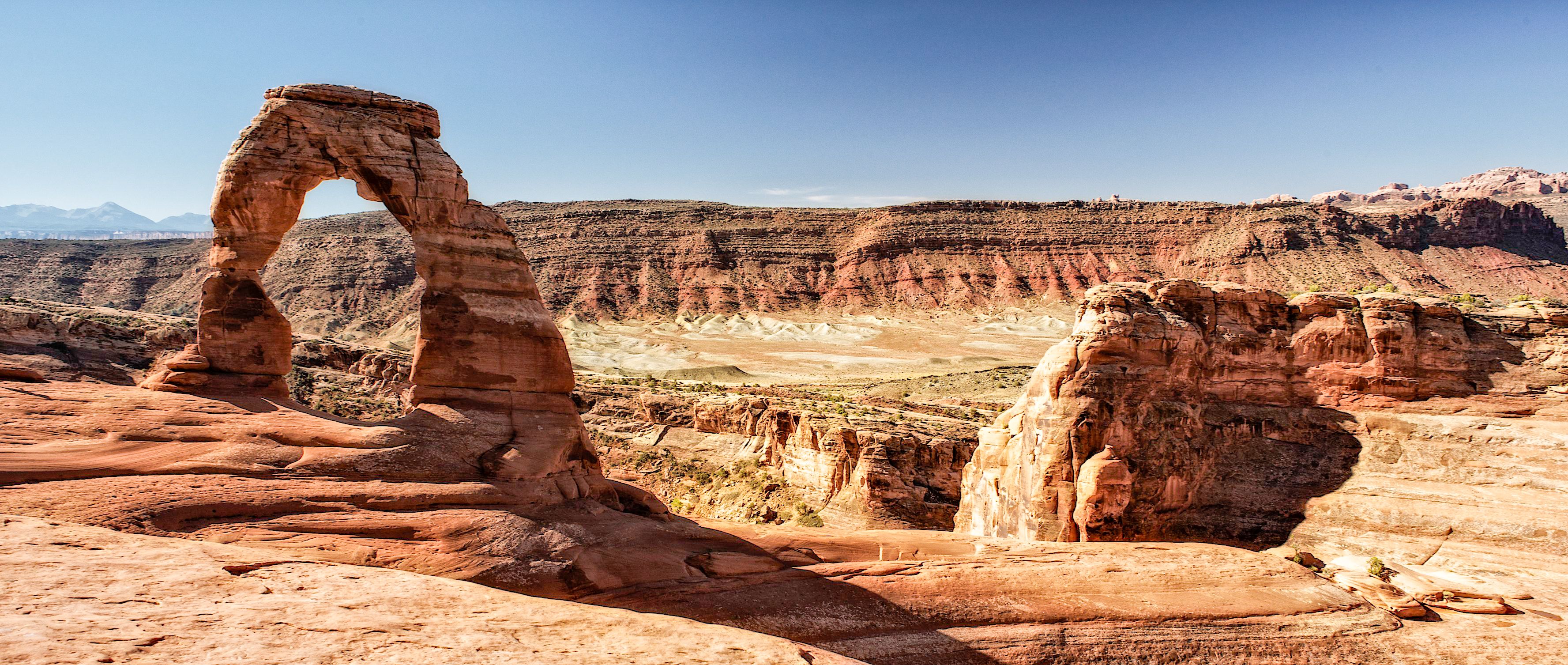 Công viên Quốc gia Arches ở miền Nam bang Utah, được đánh giá là một trong năm công viên mang tính biểu tượng của nước Mỹ với hơn 2.000 mái vòm đá sa thạch hình thù độc đáo. Trong danh sách Top 10 cổng đá vòm nổi tiếng thế giới của The Natural Arch and Bridge Society, có đến 6 cổng thuộc về tiểu bang Utah. Khi tới tiểu bang này bạn sẽ thấy biển số hay trên những tấm postcard hình ảnh Delicate Arch – kỳ quan thiên nhiên hùng vĩ, kỳ ảo nhất và được coi là biểu tượng của Utah. Delicate Arch cao 18m đứng ngạo nghễ cô độc giữa một vực sâu và núi cao, xa xa là dãy Rocky Moutain. Con đường để đi tới đây không hề dễ dàng, bạn sẽ phải đi bộ dưới trời nắng nóng 1h đồng hồ, bước qua những dốc đá cao, băng qua những bụi cây gai… nhưng khi được tận mắt chiêm ngưỡng mái vòm này, bạn sẽ thấy công sức mệt nhọc bỏ ra là hoàn toàn xứng đáng. Hãy dành thời gian đứng dưới chân những cổng đá vòm nơi đây, hít thở bầu không khí bao la của núi và cảm nhận sự kỳ diệu của tạo hóa.