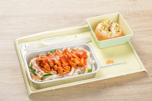 Trong tháng 3 này, hành khách của Vietnam Airlines trên đường bay giữa Hà Nội – TP.Hồ Chí Minh tiếp tục được thưởng thức nhiều món ăn mới đặc sắc. Với hạng Phổ thông, món phở xào ngũ vị là dấu ấn khó quên đến từ từng sợi phở dẻo thơm hòa quyện với thịt gà sốt cà chua, kèm thêm chút cay nồng của ớt, vị ngọt từ nước dùng gà và nước tương. Hành khách hạng Thương gia sẽ được nếm thử món bò kho nghệ ăn cùng cơm trắng thơm phức – một món ăn ngon, bổ dưỡng, có sự kết hợp cân bằng “âm – dương” theo triết lý của ẩm thực Việt.