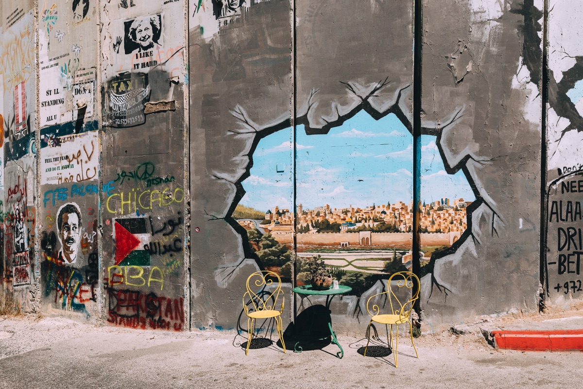 Từ Tel Aviv đi khoảng 70km về phía Tây là đến trung tâm thánh địa. Những bức tường đá dọc đường đi hay dải phân cách sừng sững West Bank thu hút sự chú ý mạnh mẽ. Không chỉ bởi các phiến đá Jerusalem và kiến trúc đặc biệt của chúng mà còn bởi dấu ấn nghệ thuật hiện hữu. Đó là những bức tranh phản chiến gây choáng ngợp của Banksy như The Armored Dove, The Masked Thug, Girl Frisking a Soldier… Càng đến gần khu phố cổ, các bức tường càng cao, càng trầm mặc còn cây cối thì nhiều và xanh tươi hơn.