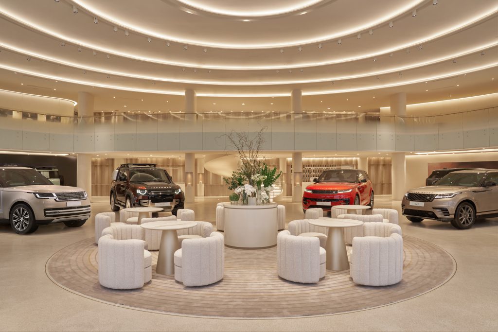 Khu vực tiếp khách ở trung tâm tầng trệt dẫn đến Không gian trưng bày các thương hiệu, nơi Range Rover, Defender và Discovery thể hiện bản sắc riêng của mình. Lấy cảm hứng từ trung tâm điêu khắc, những chiếc xe được trưng bày như các tác phẩm nghệ thuật.