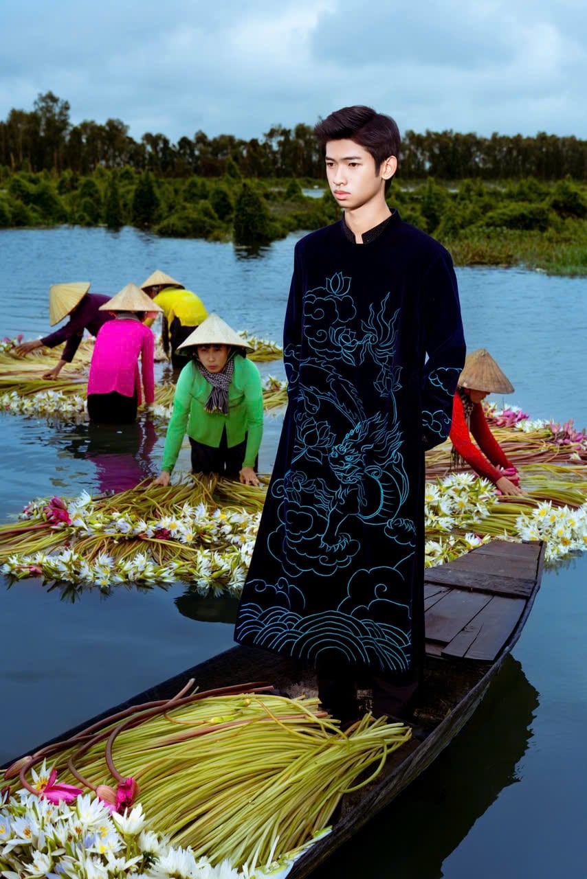 Những thiết kế mang cảm hứng từ sen của La Sen Vũ được đặt vào bối cảnh miền nước, không nhằm tạo sự đối lập, mà để tôn lên vẻ đẹp sẵn có của cảnh sắc và đời sống bản địa. Hình ảnh Dylan Khải Nguyễn hiện diện lặng lẽ giữa không gian ấy, như một điểm nhấn đương đại vừa đủ. Không phô diễn, không chiếm lĩnh khung hình, con người ở đây chỉ đóng vai trò kết nối – để thiên nhiên và văn hóa bản địa tiếp tục là nhân vật chính của câu chuyện.
