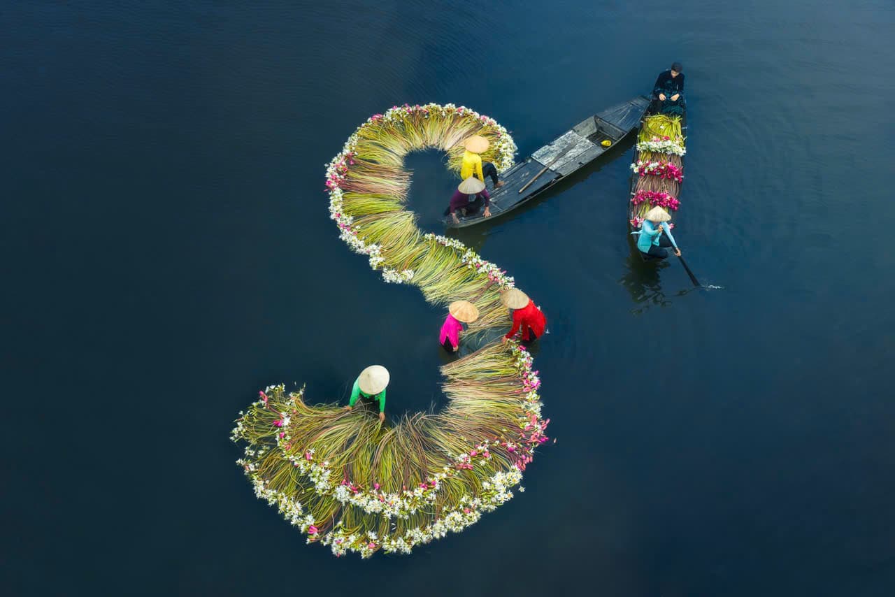 Nhìn từ trên cao, những con thuyền kết hoa sen uốn lượn thành hình mềm mại trên mặt nước, vừa tự nhiên, vừa như một sắp đặt nghệ thuật mà thiên nhiên và con người cùng hòa điệu.
