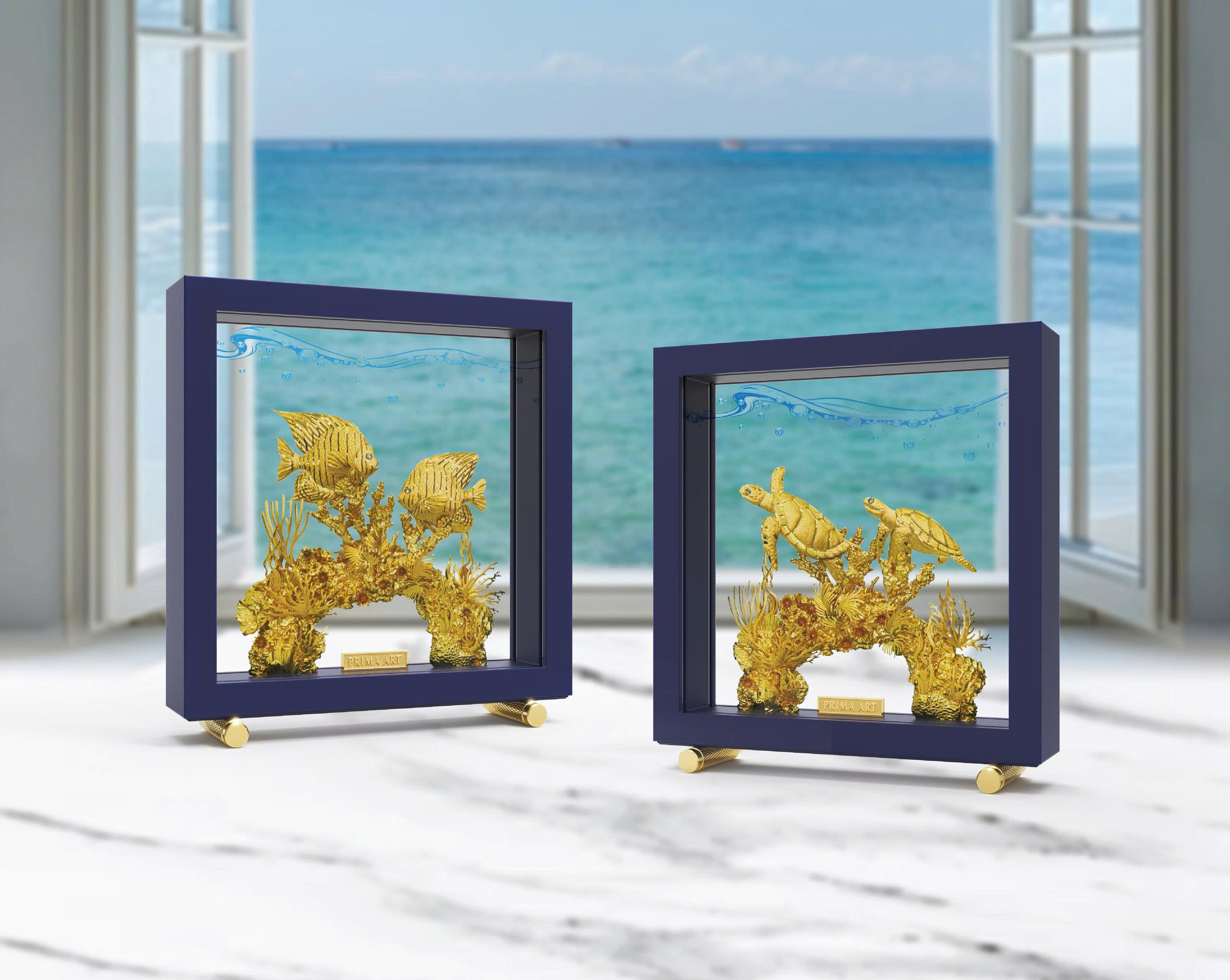 Hình tượng cá thiên thần, rùa biển và rạn san hô được chế tác thủ công tỉ mỉ, phủ vàng 24K và đặt trong khung tranh trong suốt, tạo nên hiệu ứng nổi đầy mê hoặc – như thể đại dương đang khẽ chuyển động giữa không trung.