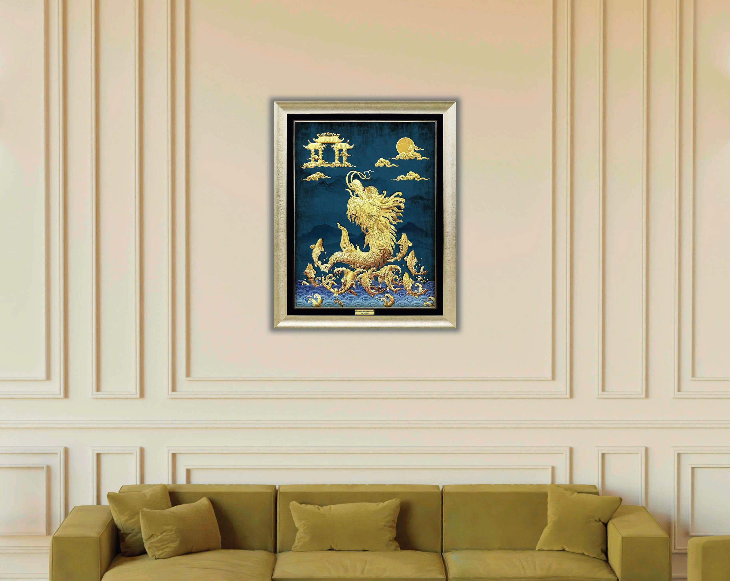 Tác phẩm Cá Chép Vượt Vũ Môn dài 1,25m tái hiện truyền thuyết cá chép hóa rồng – biểu tượng bất diệt của ý chí, lòng kiên trì và khát vọng chinh phục. Chín con cá đang vươn mình giữa làn sóng, một con đang hóa rồng giữa không trung – hình ảnh mạnh mẽ của sự chuyển mình, bứt phá và thành công.