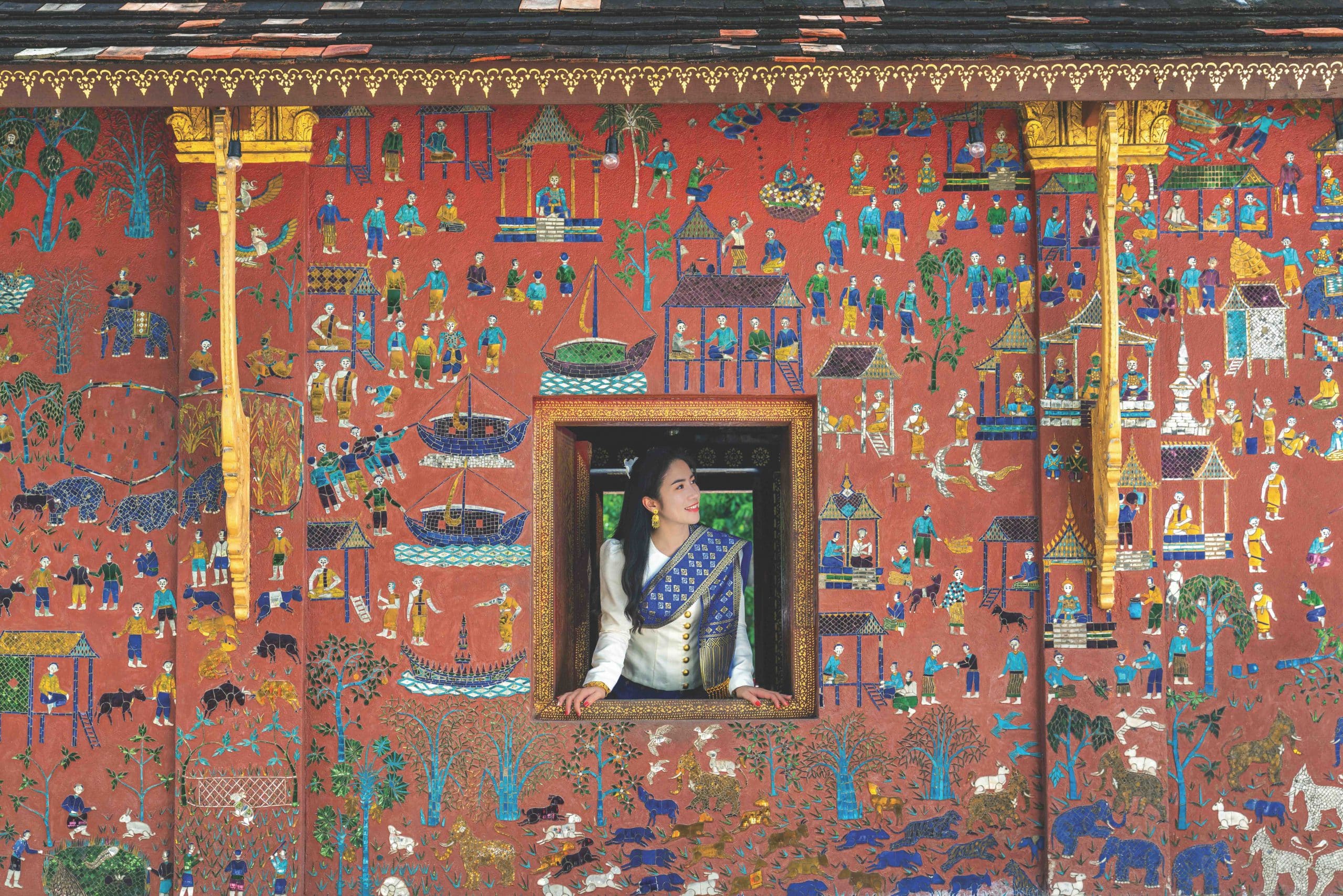 Nổi bật trong đó là Wat Xieng Thong – ngôi chùa cổ nhất Luang Prabang, với mái cong vút như cánh chim, điểm tô bằng những họa tiết khảm vàng tinh xảo trên nền sơn mài đen, những bức tường được chạm khắc với những câu chuyện về đời thường, về Phật pháp, về đất nước và người dân xứ Lào.