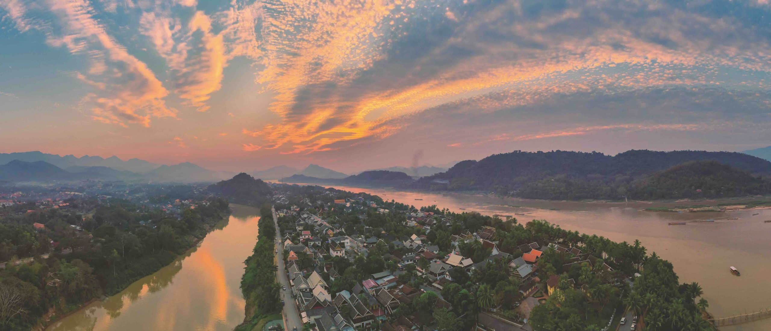 Không chỉ có chùa chiền và lịch sử, Luang Prabang còn được thiên nhiên ưu ái phủ lên tấm áo xanh dịu mát. Hai dòng sông Mekong và Nậm Khan uốn lượn ôm trọn thành phố, mang theo lớp phù sa nuôi sống cư dân bao đời. Mỗi chiều hoàng hôn, và cả tiếng chuông chùa ngân xa.